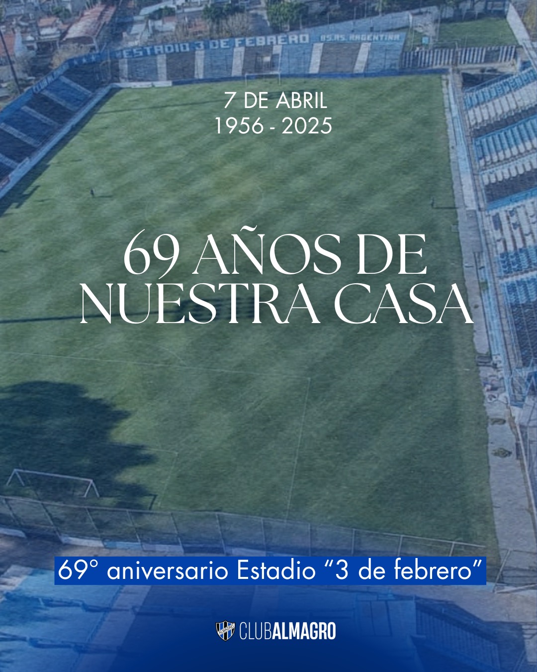 «En este aniversario, invitamos a todos a compartir y rememorar historias que han marcado la vida del club. Desde las victorias que han llenado de orgullo a los hinchas hasta las derrotas que han enseñado a perseverar, cada momento ha contribuido a forjar la identidad del Tricolor. El Estadio Tres de Febrero no es solo un lugar para jugar fútbol; es un espacio donde se vive la pasión, donde se canta con toda el alma y donde se abraza a los compañeros de aventuras en cada festejo.» afirmaron del club. Y agregaron «En este día especial, recordamos que el Estadio Tres de Febrero es nuestra casa, nuestra historia y nuestra pasión. Es el lugar donde generaciones de hinchas han crecido y han transmitido su amor por el club a sus hijos y nietos. Así que, en este 69° aniversario, celebramos no solo un estadio, sino la esencia misma del Club Almagro».