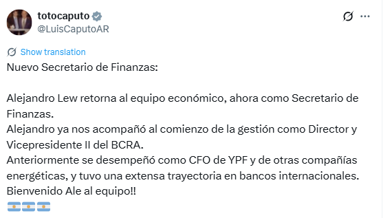 Lew no es un recién llegado al poder. Fue vicepresidente del Banco Central en los primeros meses del gobierno de Milei y antes manejó las finanzas de YPF durante la gestión de Alberto Fernández. También pasó por HSBC y JP Morgan, la oficina que se convirtió en semillero de buena parte del equipo económico actual.