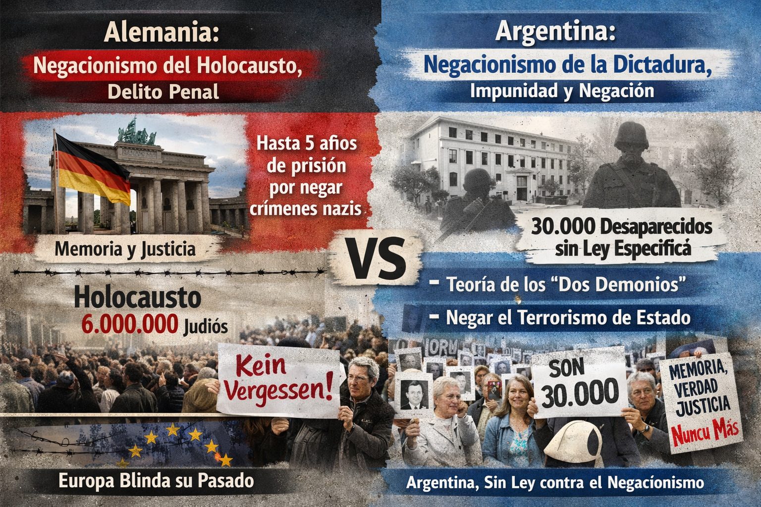 A diferencia de Alemania, Argentina carece de una ley específica contra la negación de los crímenes de lesa humanidad cometidos durante la última dictadura cívico-militar, donde se estima 30.000 desaparecidos en un plan sistemático de terrorismo de Estado. Proyectos legislativos han surgido repetidamente: en 2019 (CELE), 2020 (impulsado por Alberto Fernández inspirado en Francia), 2023 (presentado por organismos de DDHH con aval del Ejecutivo) y debates en comisiones de Diputados hasta noviembre 2023, pero ninguno prosperó en sanción. Esta ausencia permite que influencers, funcionarios y ciudadanos promuevan libremente el negacionismo bajo la «teoría de los dos demonios», que equipara la violencia guerrillera con el genocidio estatal, calificada como estrategia negacionista por jueces como Daniel Rafecas.