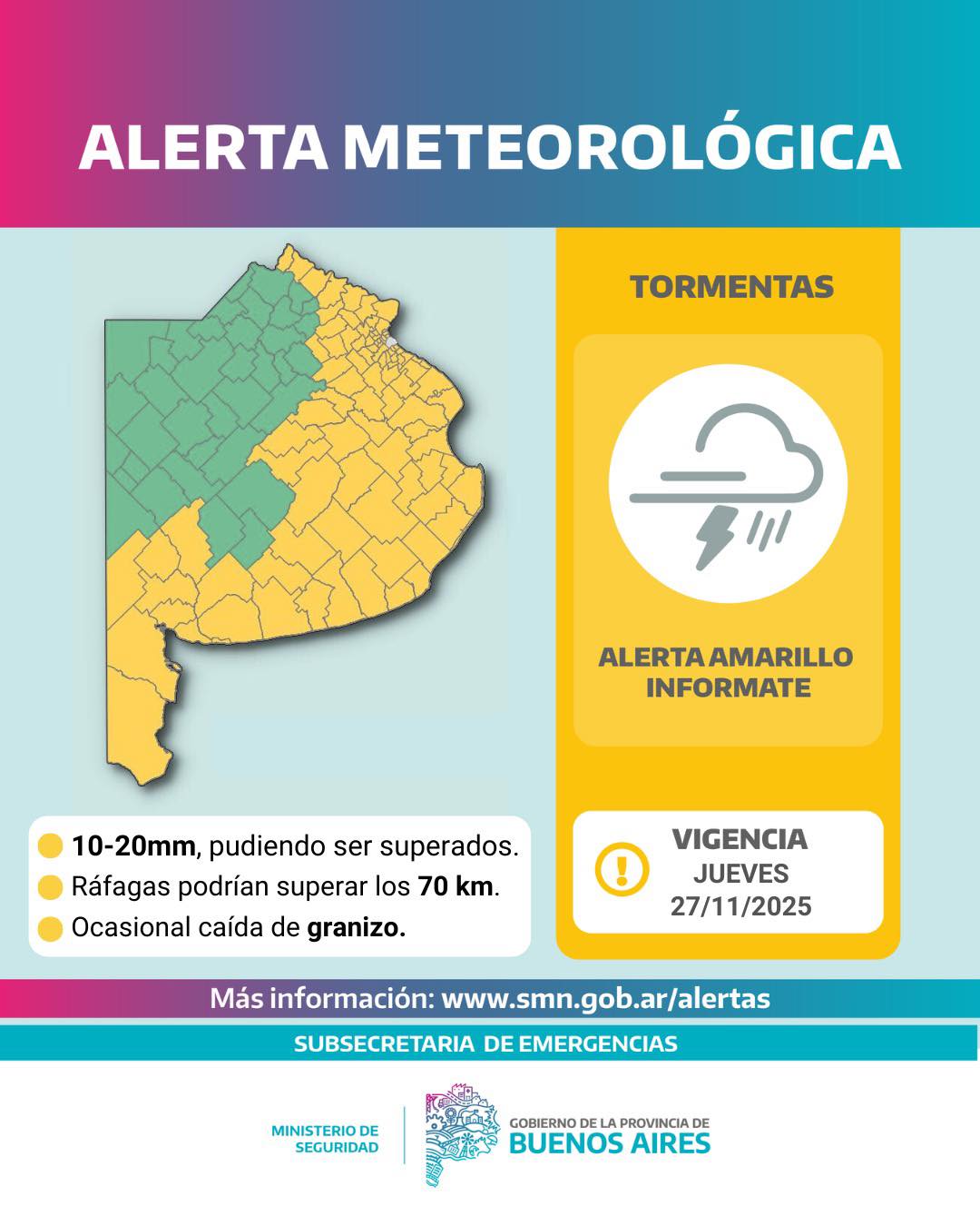 El Servicio Meteorológico Nacional (SMN) emitió una alerta amarilla por tormentas para este jueves 27 en la Provincia de Buenos Aires (PBA) y áreas del AMBA, con posibilidad de fenómenos intensos que afectan la circulación y la seguridad pública. Algunas tormentas podrán ser localmente fuertes, generando chaparrones intensos, ráfagas de viento superiores a los 70 km/h, actividad eléctrica frecuente y ocasional caída de granizo.