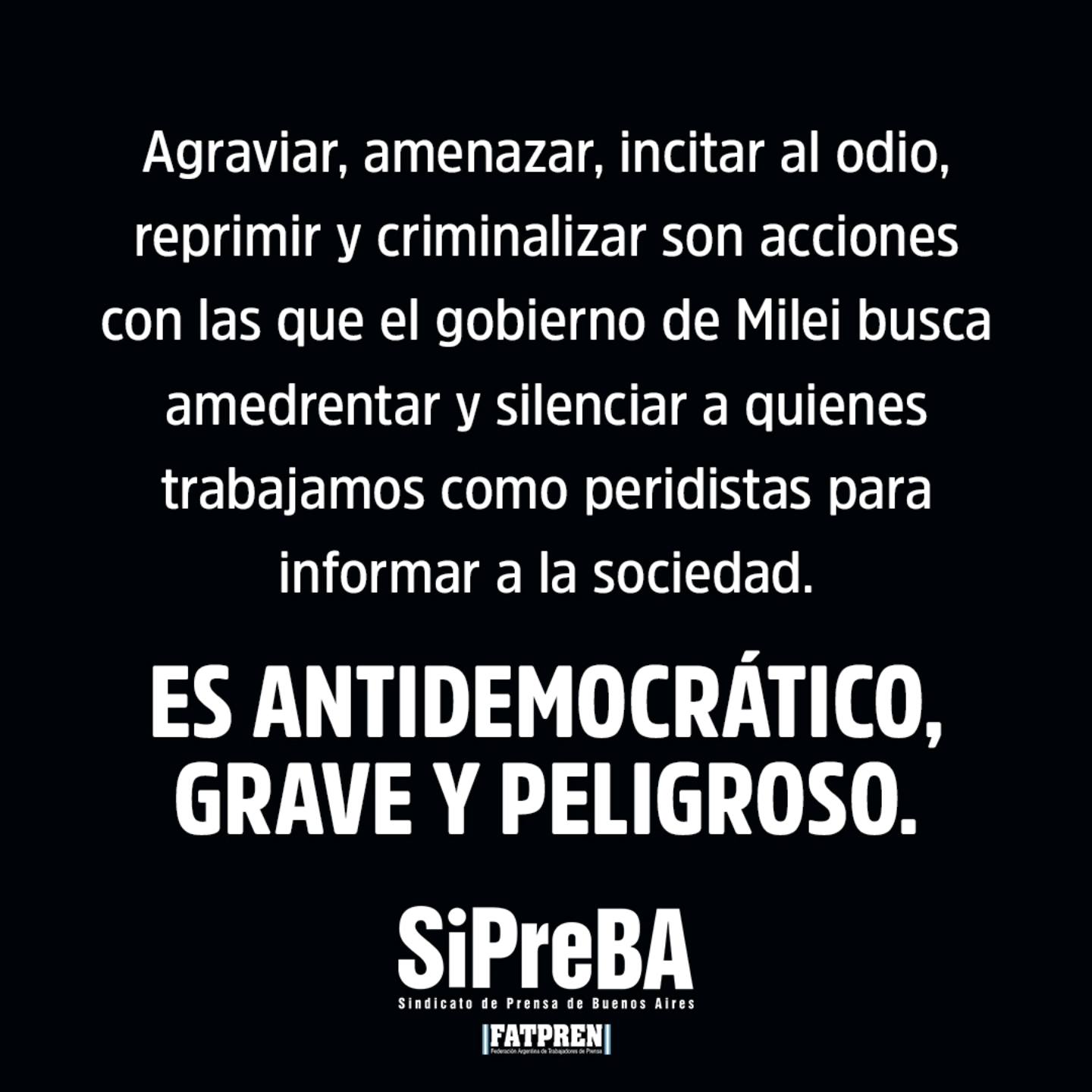 A través de un comunicado conjunto, la Federación Argentina de Trabajadores de Prensa (FATPREN) y el Sindicato de Prensa de Buenos Aires (SiPreBA) repudiaron enérgicamente los agravios, amenazas, incitaciones a la violencia, represión y criminalización que, según denuncian, buscan silenciar y denigrar el trabajo periodístico en el país.