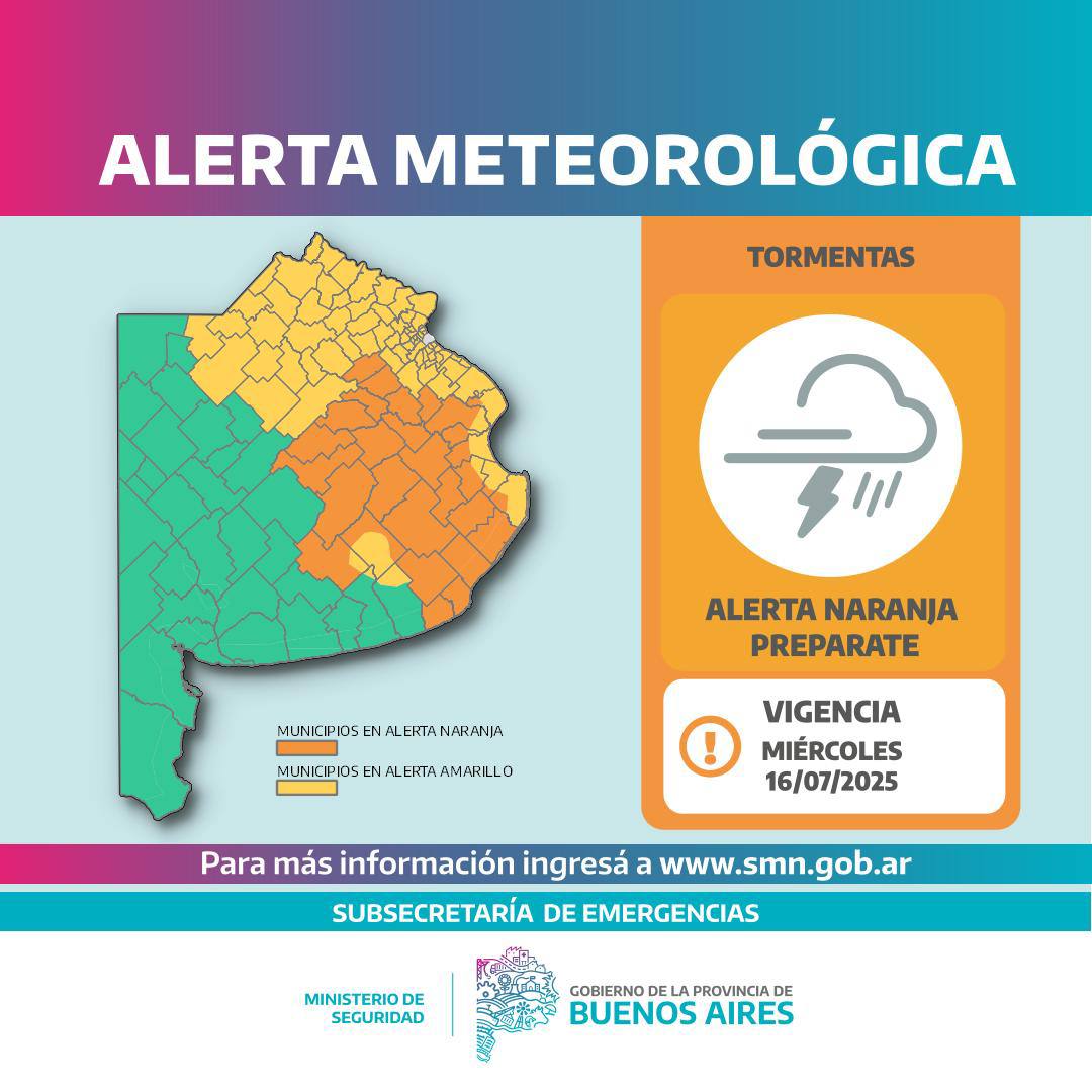 El Servicio Meteorológico Nacional (SMN) emitió un alerta por tormentas que afectarán la zona durante la madrugada del miércoles 16. Según el informe oficial, las tormentas podrán estar acompañadas de actividad eléctrica, ocasional caída de granizo, ráfagas de viento y, principalmente, una abundante caída de agua en cortos períodos.