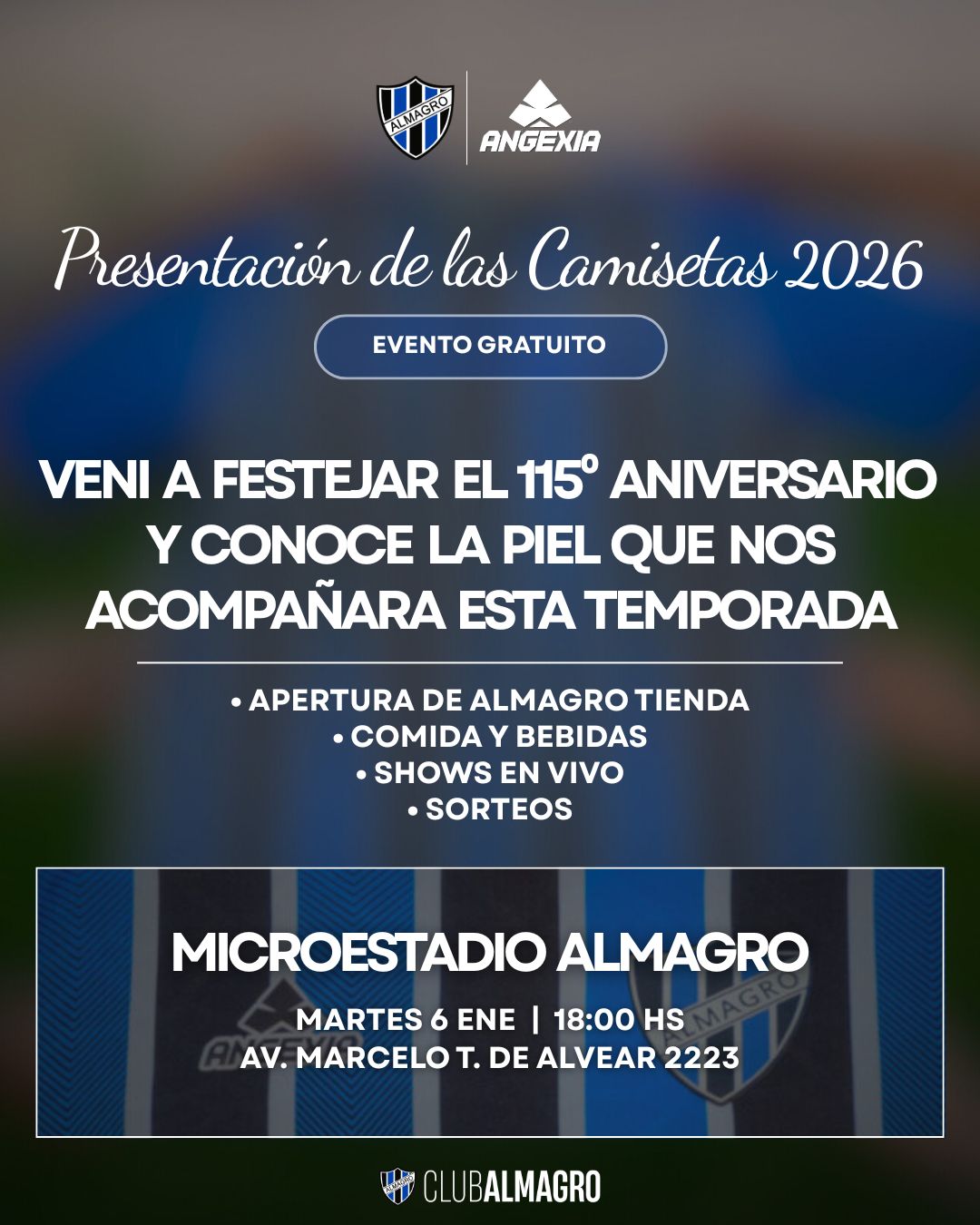 El Club Almagro invita a toda la familia tricolor a festejar sus 115 años de trayectoria este martes 6 de enero en el microestadio del club, desde las 18 horas. El evento, de entrada libre y gratuita, incluirá la presentación oficial de la camiseta que el equipo lucirá en el Torneo de la Primera Nacional 2026, además de shows en vivo y sorteos especiales.