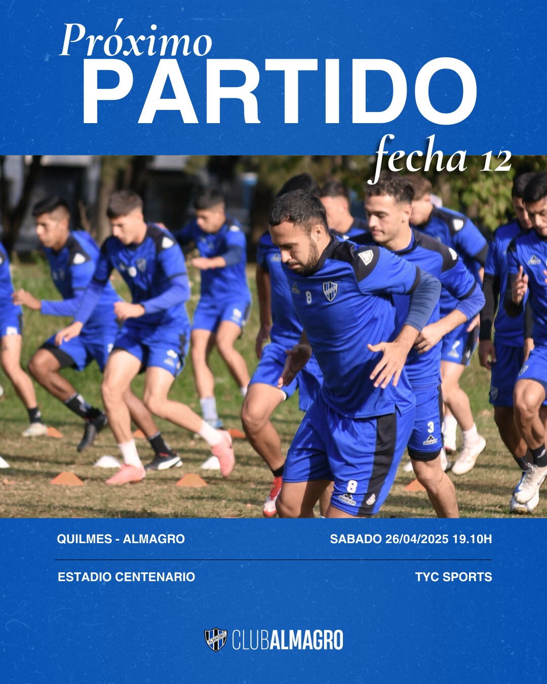 El Club Almagro enfrentará este sábado 26 de abril a Quilmes como visitante en el Estadio Centenario de Quilmes (19:10 H), en un duelo clave para mantenerse en la pelea por los puestos de ascenso de la Zona A. El equipo, dirigido por, Jorge Cordon llega con altibajos en su rendimiento, tras una derrota 3-1 ante Deportivo Maipú en la fecha anterior.
