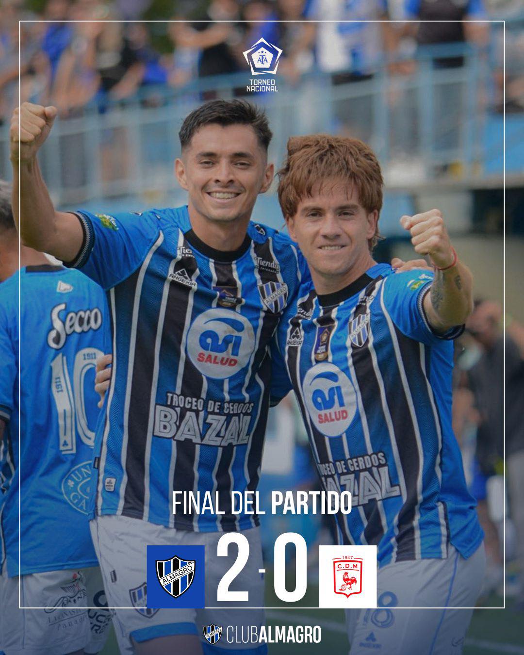 Tricolor no pasó mayor apuro en Tres de Febrero y superó 2-0 a Dep. Morón, por la fecha 7 de la Primera Nacional. Fue Enzo Martínez quien marcó el primer gol para Almagro a los 10 minutos de la primera mitad, mientras que el delantero Mateo Benegas sentenció el partido al no perdonar al portero rival en el minuto 0 de la segunda etapa.