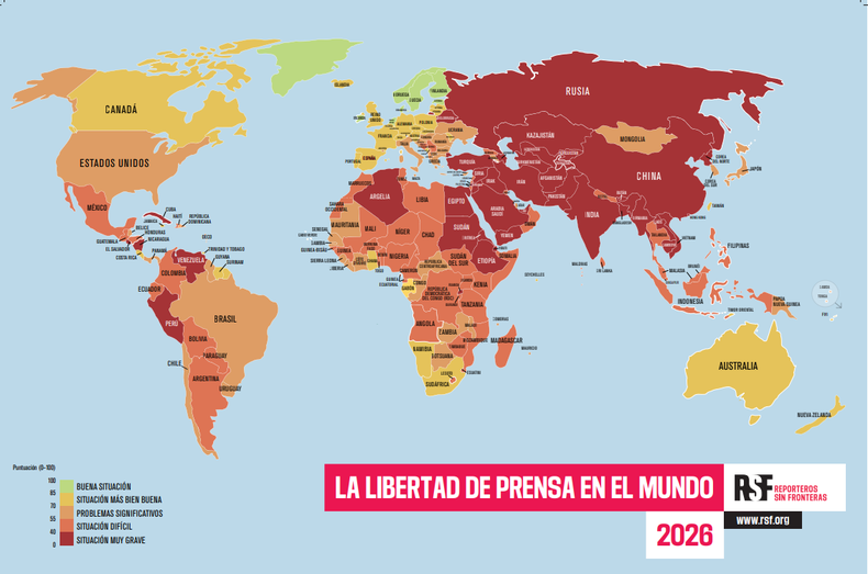 A nivel mundial, el diagnóstico es aún más contundente. La clasificación 2026 de RSF señala que la libertad de prensa atraviesa su peor momento en un cuarto de siglo. Más de la mitad de los países se encuentran en situación “difícil” o “muy grave”, cuando en 2002 esa proporción era marginal.