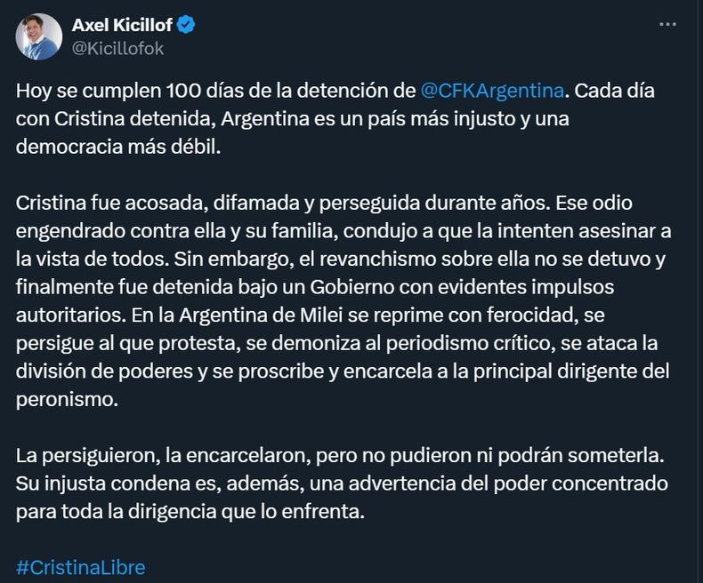 «Hoy se cumplen 100 días de la detención de Cristina. Cada día con Cristina detenida, Argentina es un país más injusto y una democracia más débil», destacó la máxima autoridad bonaerense a través de una publicación en la red social X.