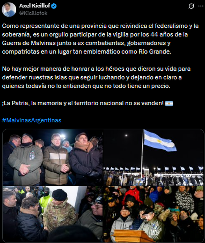 “Como representante de una provincia que reivindica el federalismo y la soberanía, es un orgullo participar de la vigilia por los 44 años de la Guerra de Malvinas junto a ex combatientes, gobernadores y compatriotas en un lugar tan emblemático como Río Grande”, expresó Kicillof en su publicación.