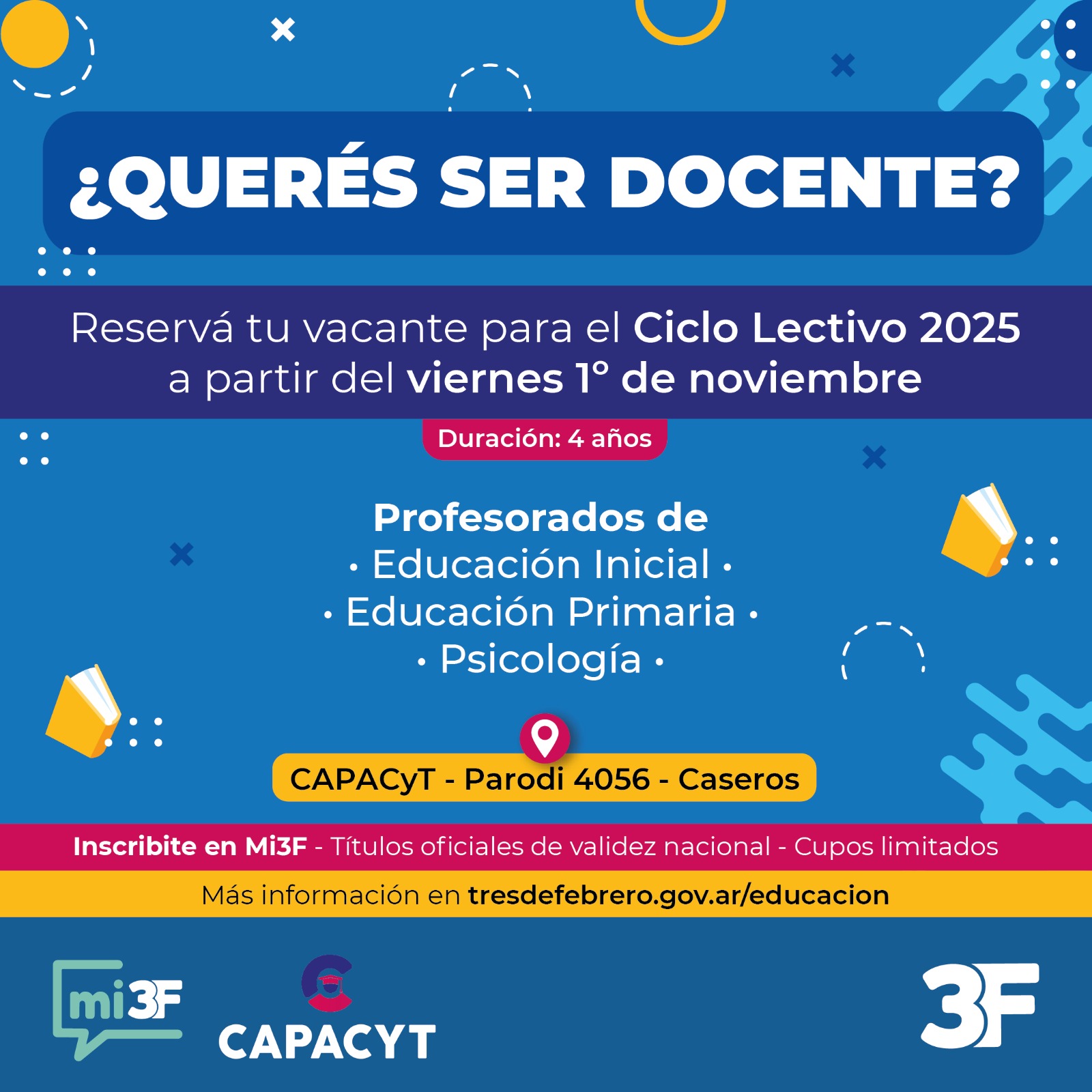Los interesados pueden reservar su vacante a través de la plataforma Mi3F, lo que facilita el proceso de inscripción para quienes desean formarse en psicología y en los niveles inicial y primario.
