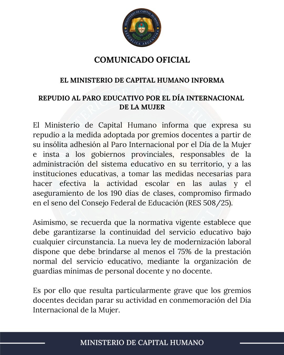 El Ministerio de Capital Humano, liderado por Sandra Pettovello, emitió un comunicado repudiando el paro de gremios docentes en adhesión al Día Internacional de la Mujer el 9 de marzo de 2026. Esta medida afectó escuelas públicas en Buenos Aires y otras provincias, pero no el sector privado. El tono del rechazo busca resaltar la prioridad de la educación sobre reclamos políticos, apelando a votantes que valoran la continuidad escolar.