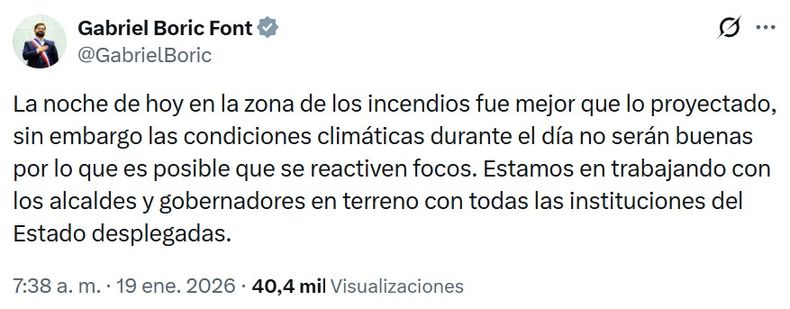 Por otra parte, en su cuenta de X el jefe de Estado, comunicó que “la noche de hoy (por el domingo) en la zona de los incendios fue mejor que lo proyectado, sin embargo, las condiciones climáticas durante el día no serán buenas por lo que es posible que se reactiven focos”.