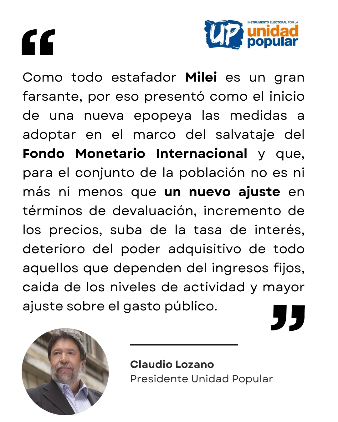 En su análisis, el referente de Unidad Popular considera que recurrir nuevamente al endeudamiento externo solo perpetúa un ciclo de dependencia y condicionamientos, sin resolver los problemas estructurales de la economía argentina. Según Lozano, el acuerdo con el FMI no solo no traerá soluciones, sino que agravará la situación social y económica del país.