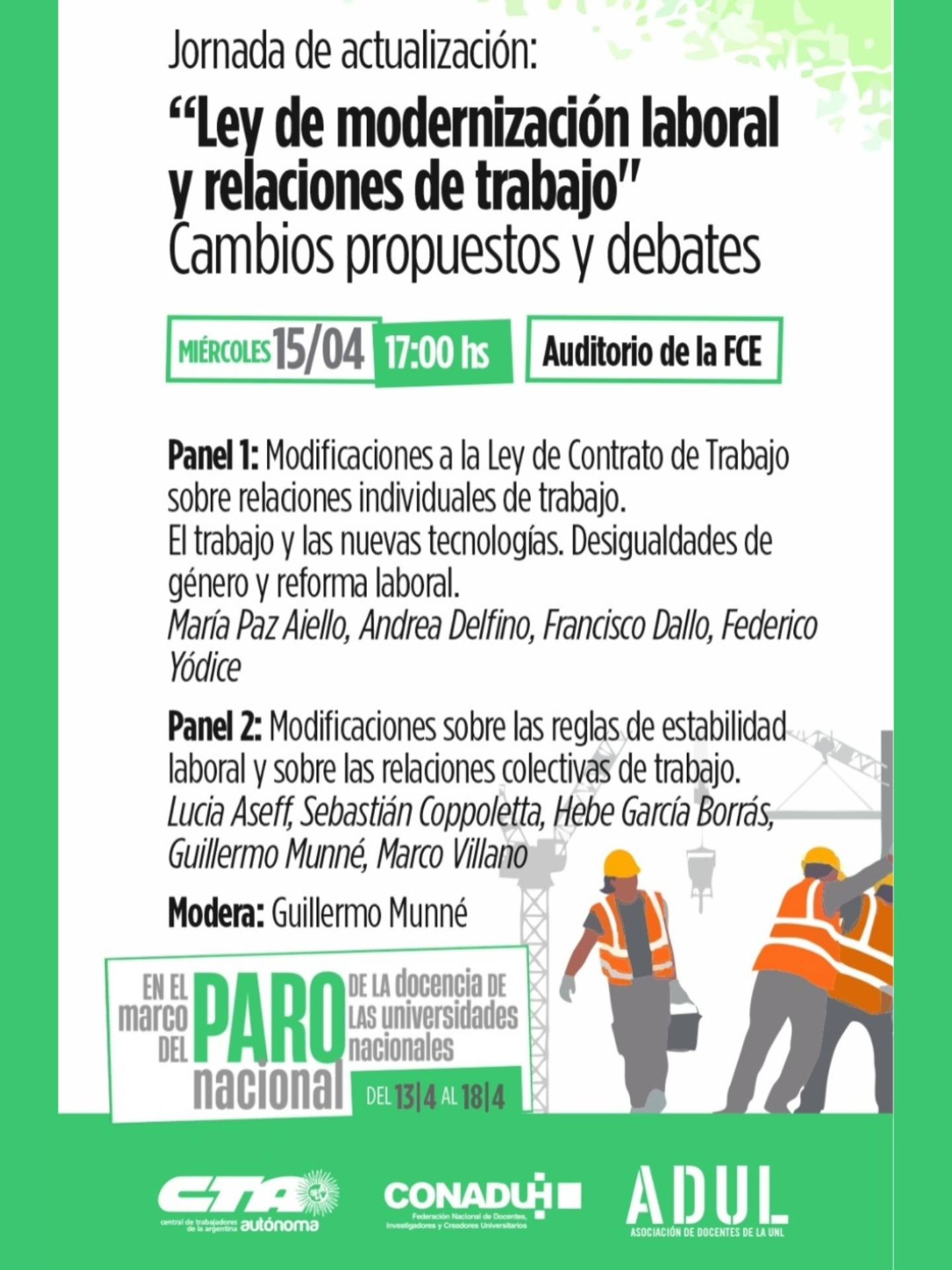 La Central de Trabajadores de la Argentina (CTA) Autónoma nacional intensifica sus acciones de protesta con una jornada de debate sobre la reciente reforma laboral, enmarcada en la semana de paro por el financiamiento universitario. El evento se realizará el miércoles 15 de abril a las 17 horas en el Auditorio de la Facultad de Ciencias Económicas de la Universidad Nacional del Litoral (UNL), en Santa Fe.