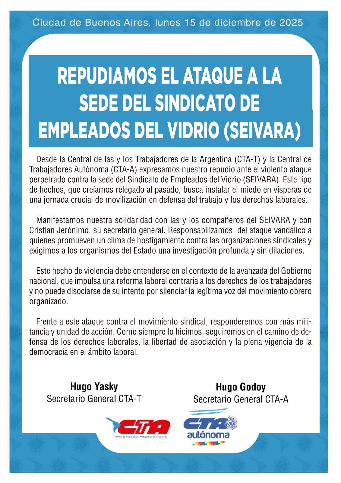 Las dos centrales obreras de Argentina, la Central de Trabajadores de la Argentina (CTA-T) y la Central de Trabajadores Autónoma (CTA-A), emitieron un duro comunicado conjunto repudiando el «violento ataque» perpetrado contra la sede del Sindicato de Empleados del Vidrio (SEIVARA).