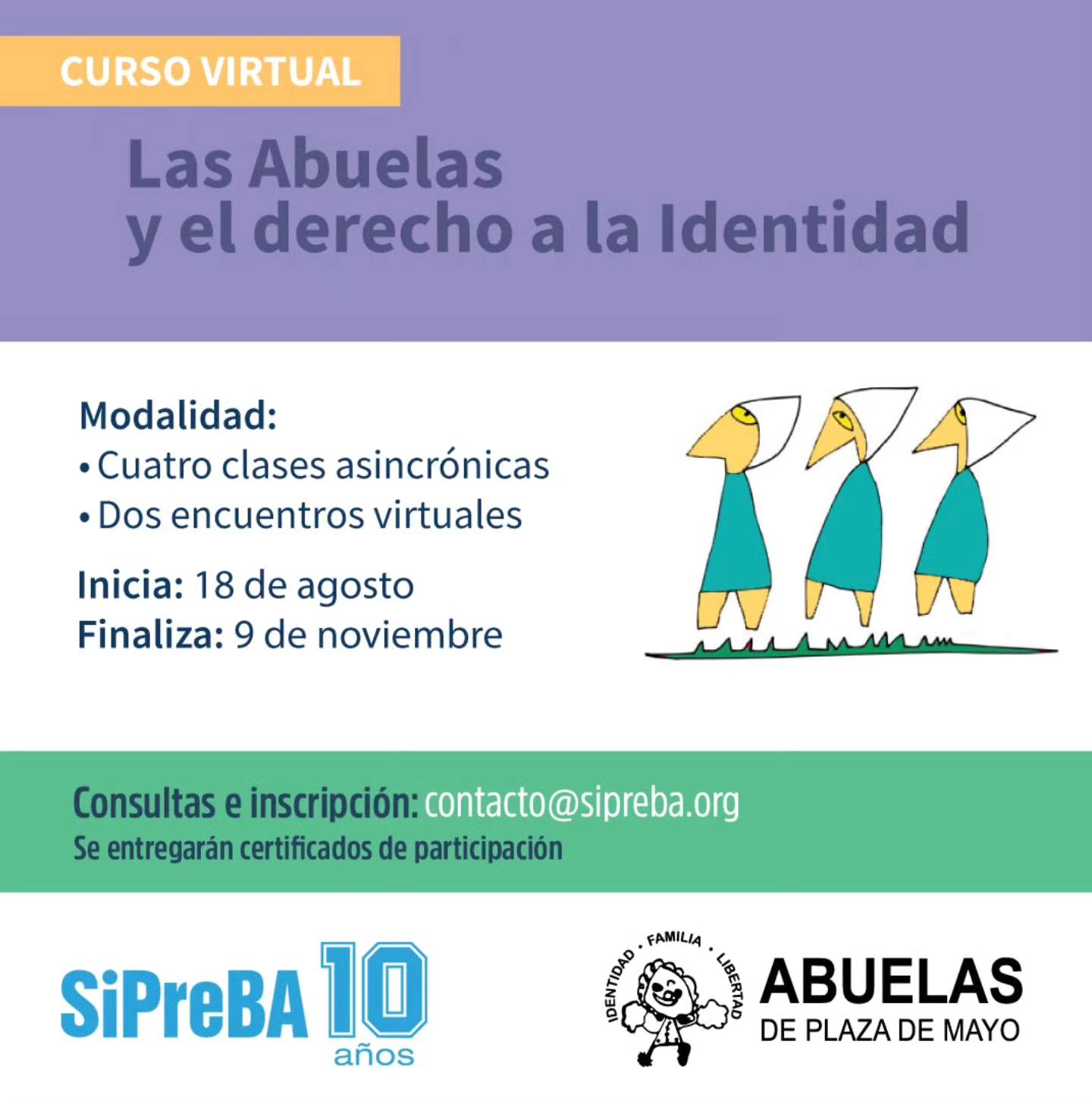 El curso, titulado “Las Abuelas y el Derecho a la Identidad” , está destinado a afiliados y afiliadas de SIPREBA, quienes podrán inscribirse de manera gratuita. La capacitación inicia el próximo 18 de agosto y se estructura en cuatro encuentros asincrónicos quincenales junto a dos encuentros sincrónicos optativos , brindando flexibilidad para adaptarse a distintos ritmos de aprendizaje.