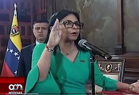 La nueva presidenta encargada fue juramentada por el presidente de la Asamblea Nacional —Poder Legislativo—, quien es su hermano Jorge Rodríguez.