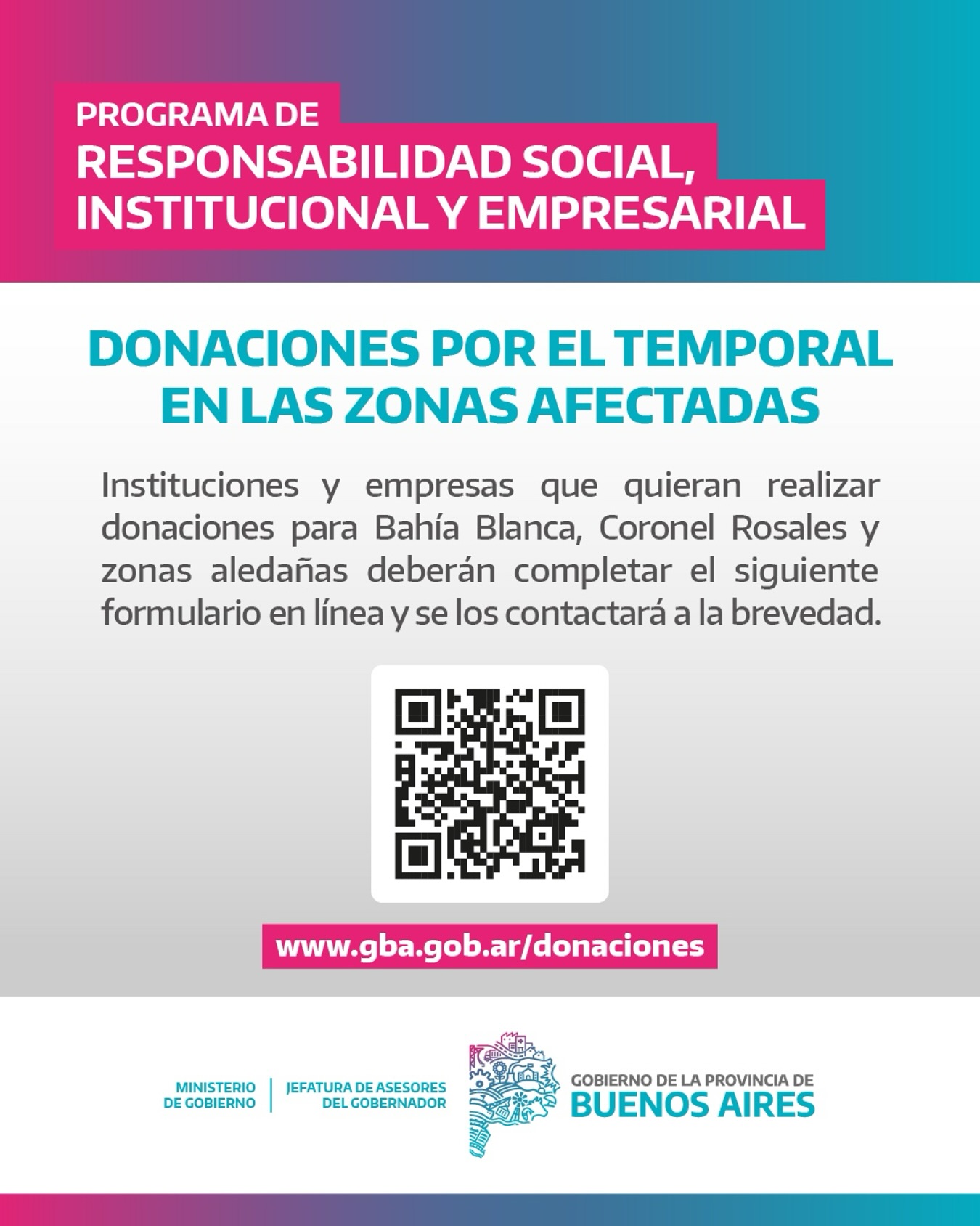El gobierno de la provincia de Buenos Aires ha habilitado un formulario en línea en su sitio web (www.gba.gob.ar/donaciones) para que empresas e instituciones puedan coordinar sus donaciones. Esta iniciativa busca centralizar los esfuerzos de ayuda y asegurar que los recursos lleguen de manera efectiva a las zonas más necesitadas.