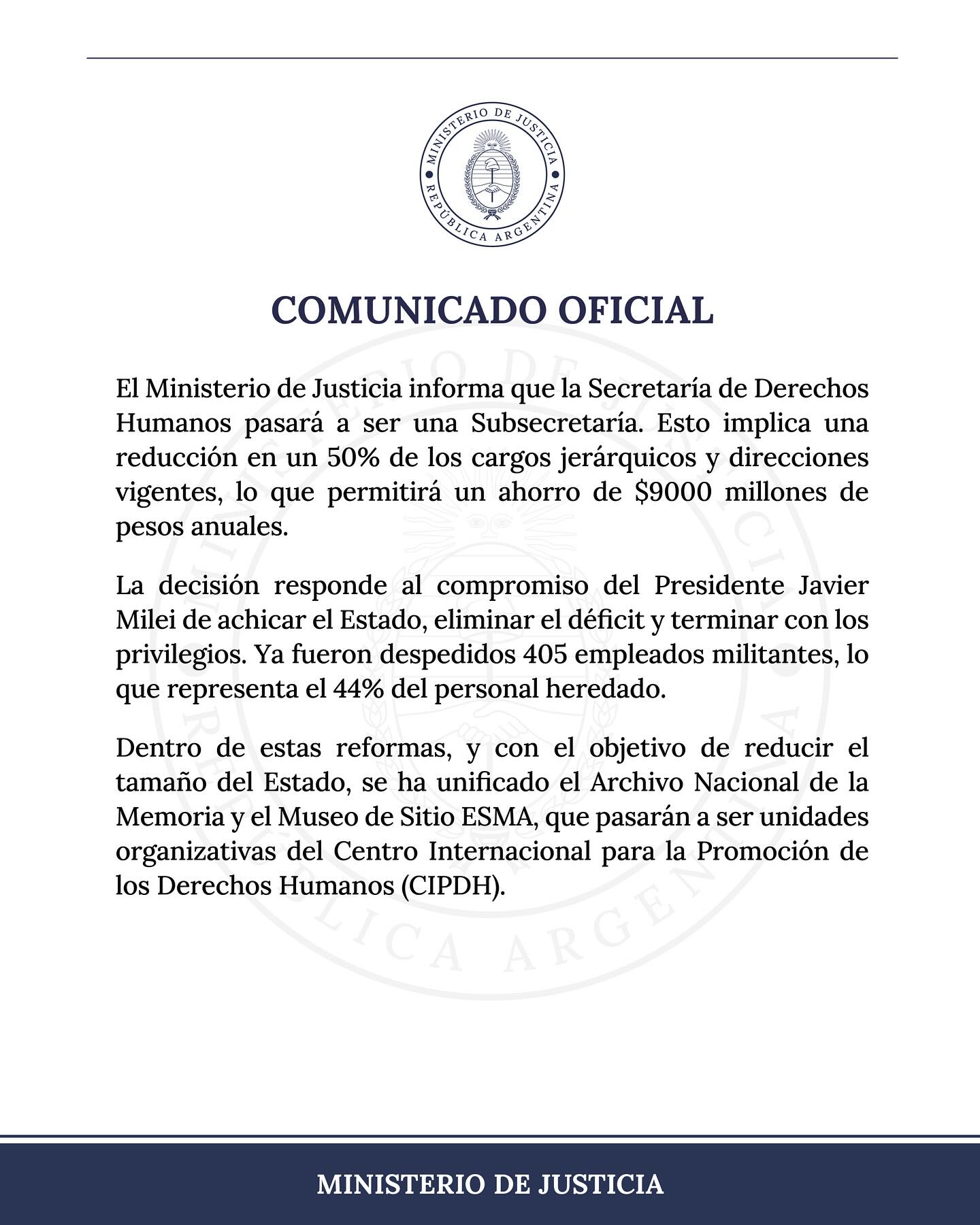En una decisión que ha generado un fuerte rechazo en amplios sectores sociales y políticos, el Ministerio de Justicia anunció que la Secretaría de Derechos Humanos será degradada a Subsecretaría.