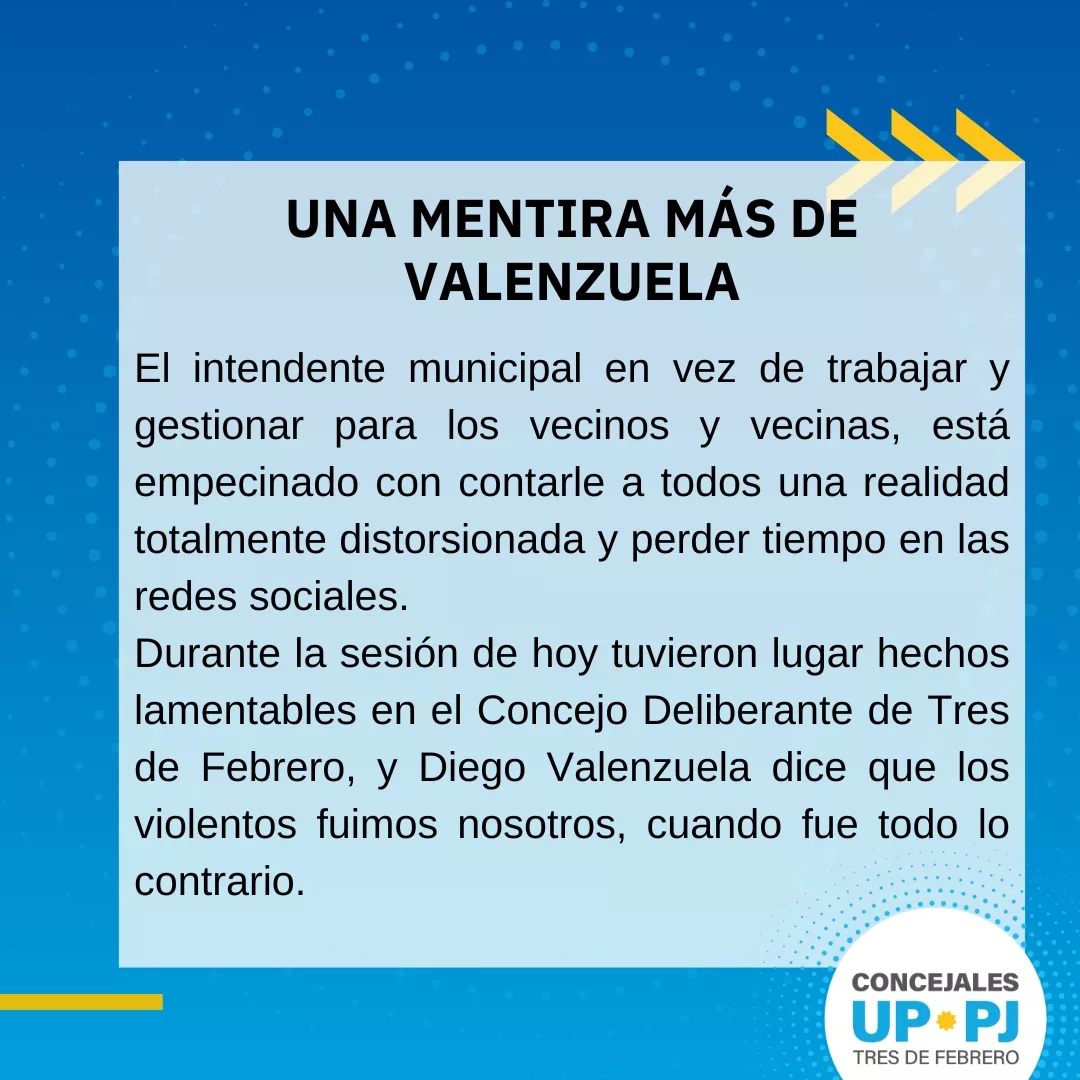 Los concejales de Unión por La Patria de Tres de Febrero emitieron un comunicado para desmentir las acusaciones de violencia realizadas por el intendente Diego Valenzuela.