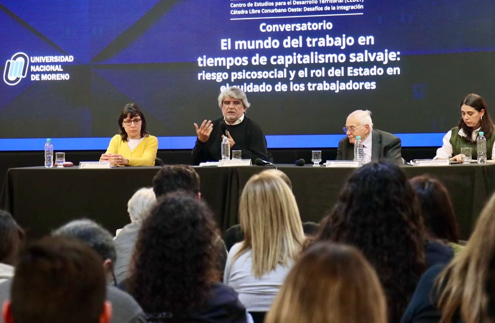 El ministro de Trabajo de la provincia de Buenos Aires, Walter Correa, acompañó al profesor emérito de la Universidad Nacional de Moreno (UNM), Julio Neffa, y a la docente Máxima Guglialmeni en el panel titulado “El mundo del trabajo en tiempos de capitalismo salvaje: riesgo psicosocial y el rol del Estado en el cuidado de los trabajadores”, que se realizó en esa casa de altos estudios.