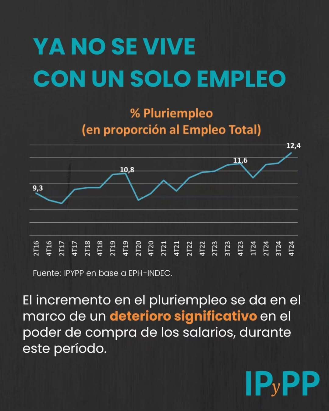El nuevo informe del Instituto de Pensamiento y Políticas Públicas (IPyPP) revela un fenómeno creciente y preocupante en el mercado laboral argentino: el aumento histórico del pluriempleo, que afecta a 2,4 millones de personas, equivalente al 12,4% de la población ocupada, según datos del cuarto trimestre de 2024.