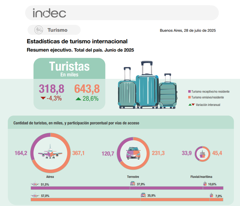 En junio, más de 1.219 mil argentinos viajaron al exterior mientras que cerca de 542 mil visitantes ingresaron al país, informo este lunes el Instituto Nacional de Estadísticas y Censos (INDEC).