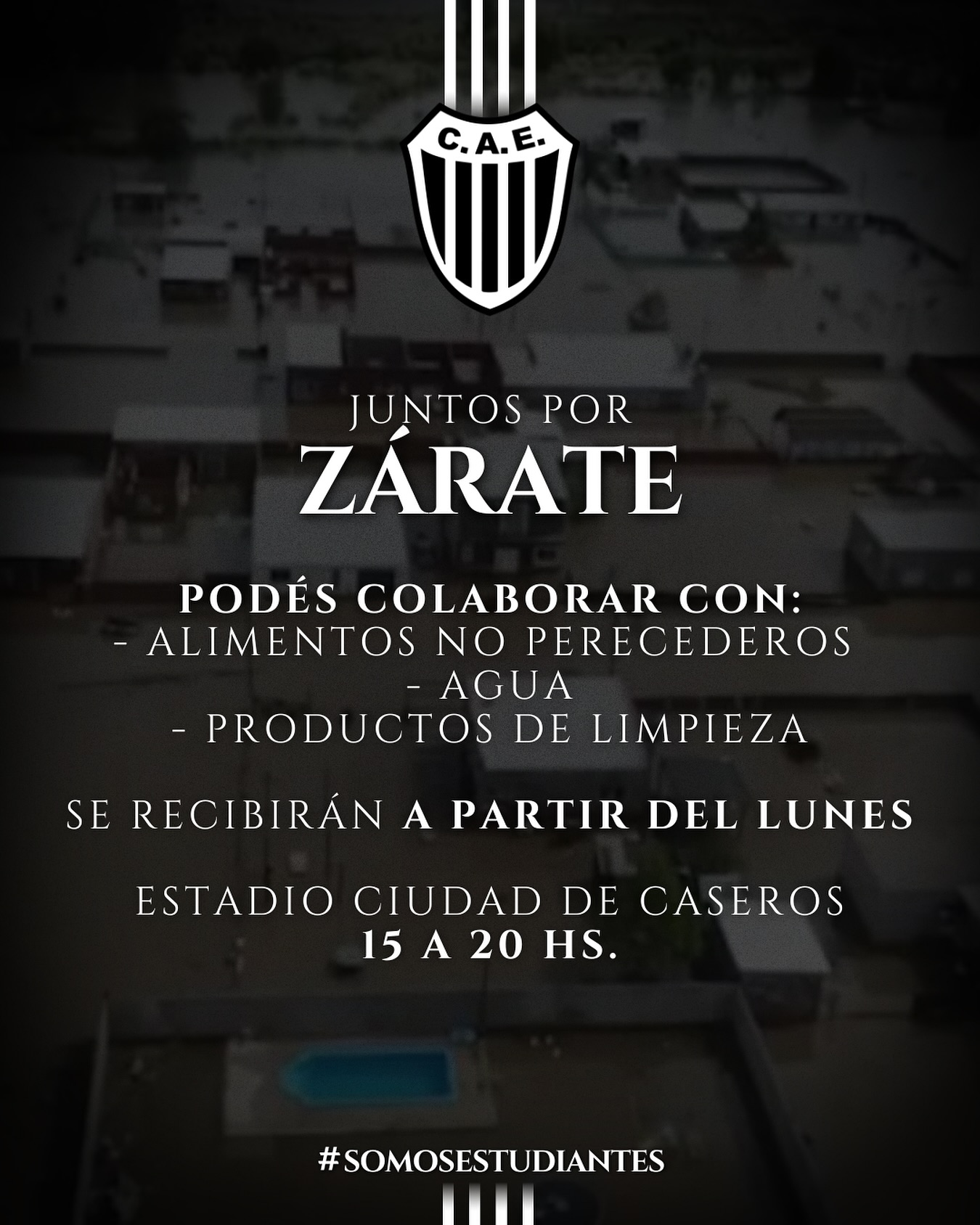 El Club Estudiantes de Buenos Aires lanzó un comunicado a través de sus redes sociales convocando a la comunidad a sumarse a una campaña solidaria para ayudar a los damnificados por las recientes inundaciones en la localidad de Zárate.