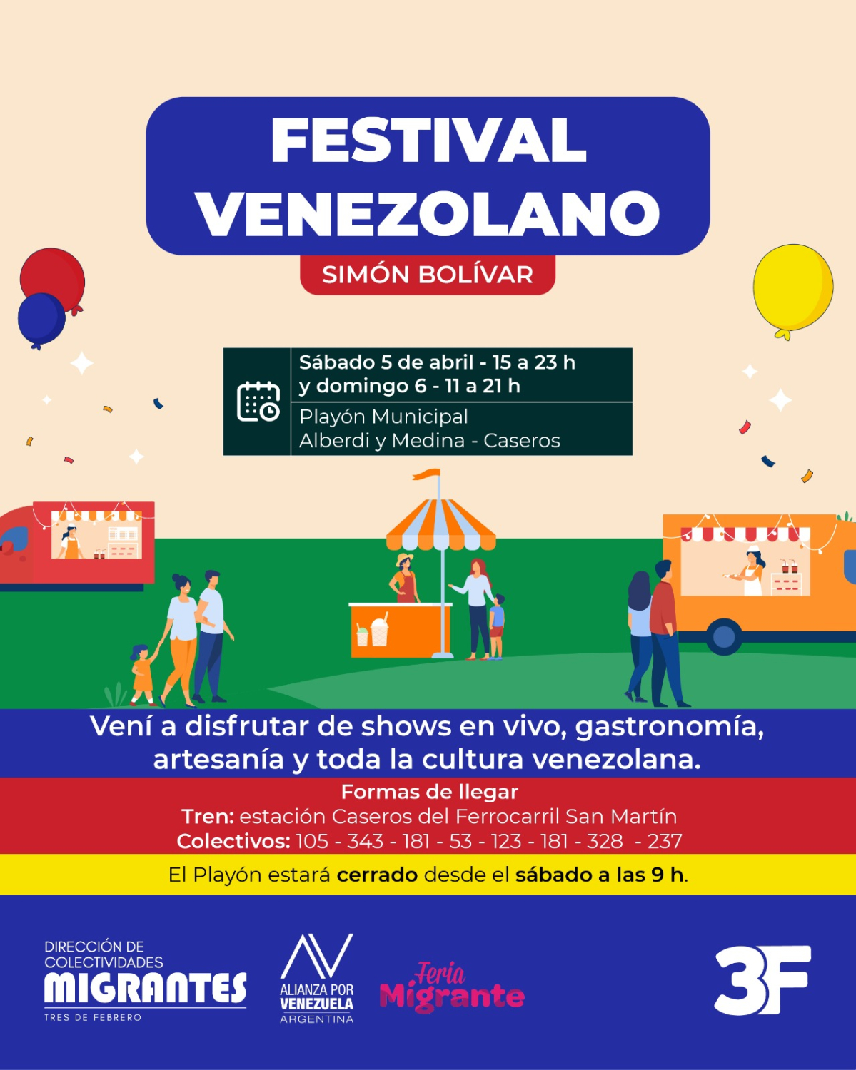 Este fin de semana, la Municipalidad de Tres de Febrero, en colaboración con Alianza por Venezuela, una organización opositora al chavismo y al gobierno de Nicolás Maduro, lleva adelante un festival cultural en el Playón Municipal de Caseros.