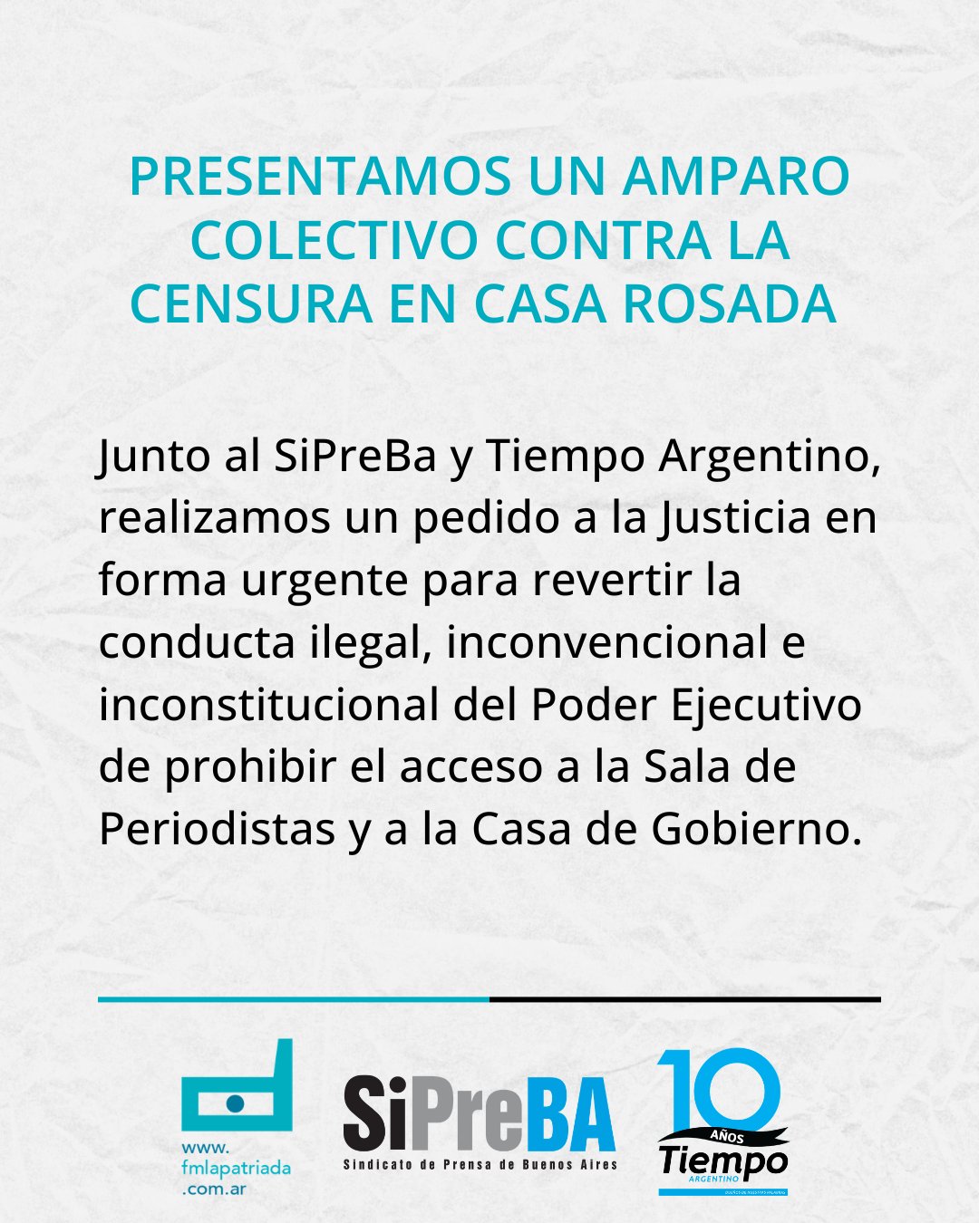 Buenos Aires, 28 de abril de 2026 – En un nuevo reclamo conjunto, FM La Patriada, Tiempo Argentino y el Sindicato de Prensa de Buenos Aires (SiPreBa) presentaron hoy un pedido urgente a la Justicia para revertir la «conducta ilegal, inconvencional e inconstitucional» del Poder Ejecutivo, que desde el jueves 23 de abril prohíbe el acceso de periodistas acreditados a la Sala de Periodistas y la Casa de Gobierno.