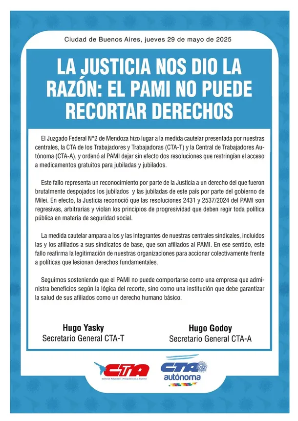La medida judicial abarca específicamente a los afiliados al PAMI que están nucleados dentro de ambas CTA. “Este fallo reafirma la legitimación de nuestras organizaciones para accionar colectivamente frente a políticas que lesionan derechos fundamentales”, señalaron.