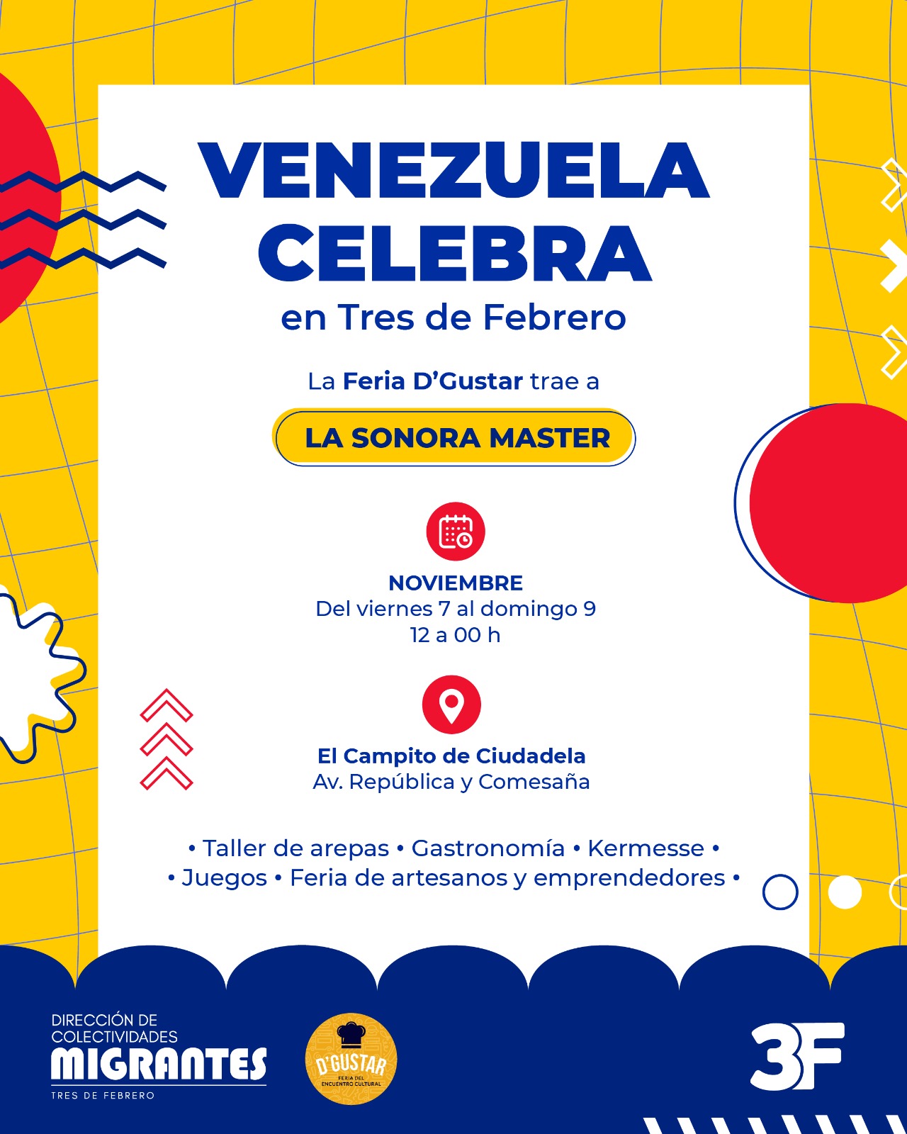 El evento “Venezuela Celebra” organizado por la Municipalidad de Tres de Febrero es una celebración de la cultura venezolana que se desarrollará desde el viernes 7 hasta el domingo 9 de noviembre en “El Campito” de Ciudadela, con entrada libre y abierta a toda la comunidad.