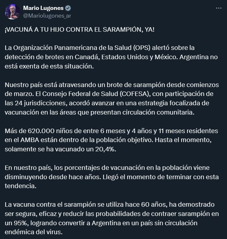La segunda acción fue una declaración pública de Lugones, quien a través de su cuenta en la red social X realizó un pedido a la ciudadanía: «¡Vacuná a tu hijo contra el sarampión, ya!». En la misma publicación, el ministro expuso a la baja cobertura de vacunación: «Más de 620 mil niños, de entre 6 meses y 4 años y 11 meses, residentes en el AMBA están dentro de la población objetivo. Hasta el momento, solamente se ha vacunado un 20,4%».