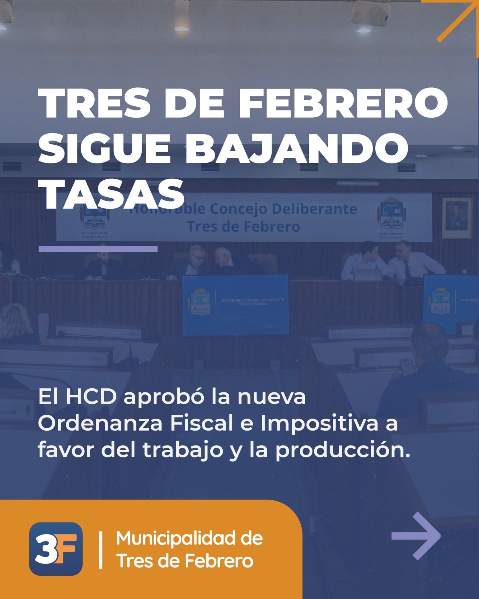 El Honorable Concejo Deliberante (HCD) de Tres de Febrero aprobó ayer la Ordenanza Fiscal e Impositiva 2025, impulsada por el oficialismo bajo el lema «Menos impuestos, más trabajo». El municipio calcula reducciones de hasta un 75% en algunas áreas.