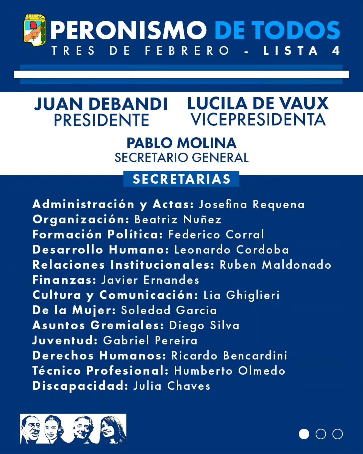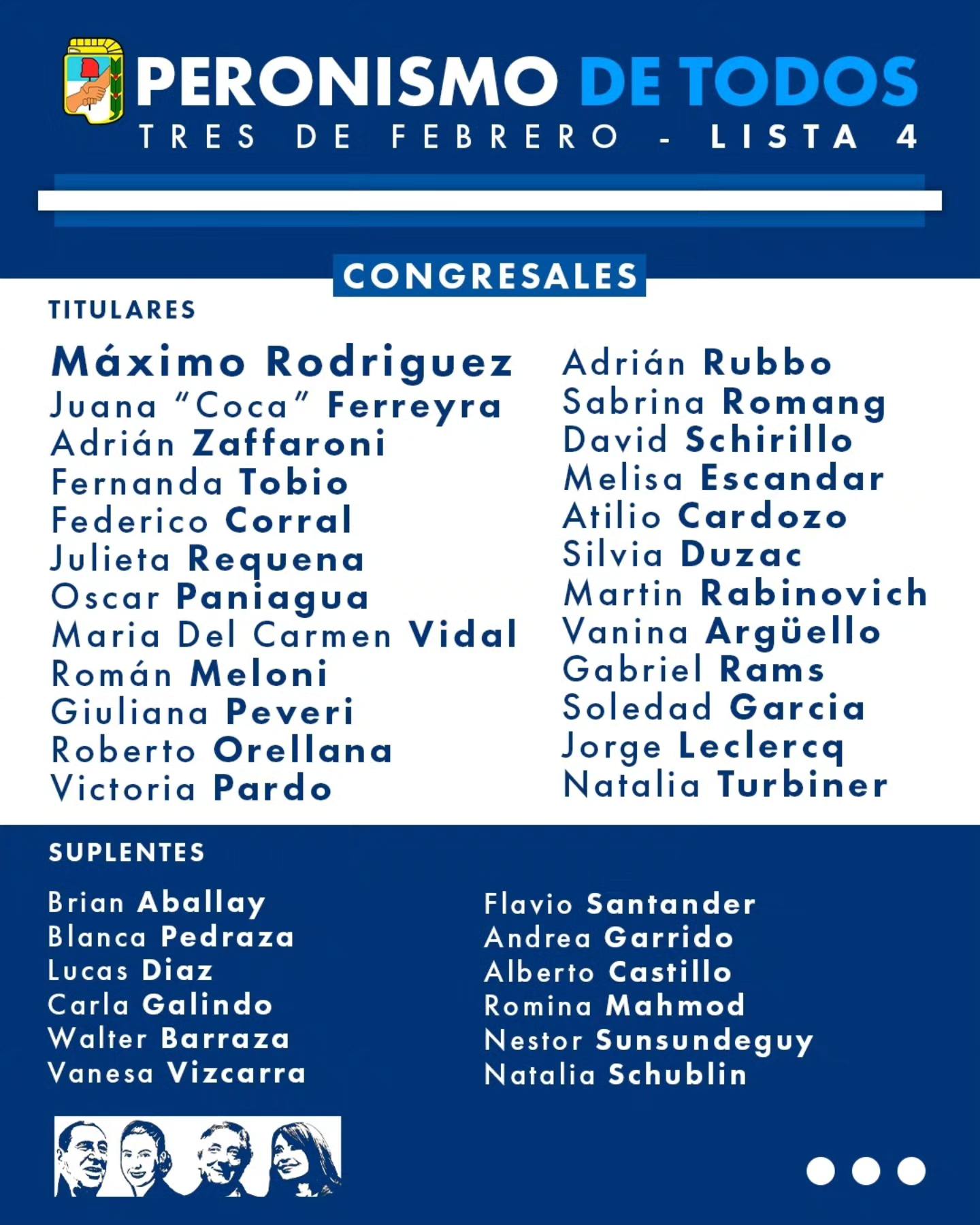 «Esta es la Lista 4, Peronismo de Todos. Compañeras y Compañeros de cada barrio, de la militancia y del trabajo diario, del movimiento obrero, de la juventud, de la tercera edad, de la diversidad, de fuerzas vivas de la comunidad y con trayectoria militante. Una Lista que expresa organización, representación y compromiso con Tres de Febrero. No es una suma de nombres. Es un proyecto colectivo, para discutir cómo abordar y resolver las urgencias de nuestro pueblo, y cómo lograr que la comunidad se involucre en la construcción de nuestro futuro. Seguimos construyendo el Peronismo de Todos, el de PERÓN, EVITA, NÉSTOR Y CRISTINA», declaró Debandi en su cuenta oficial.