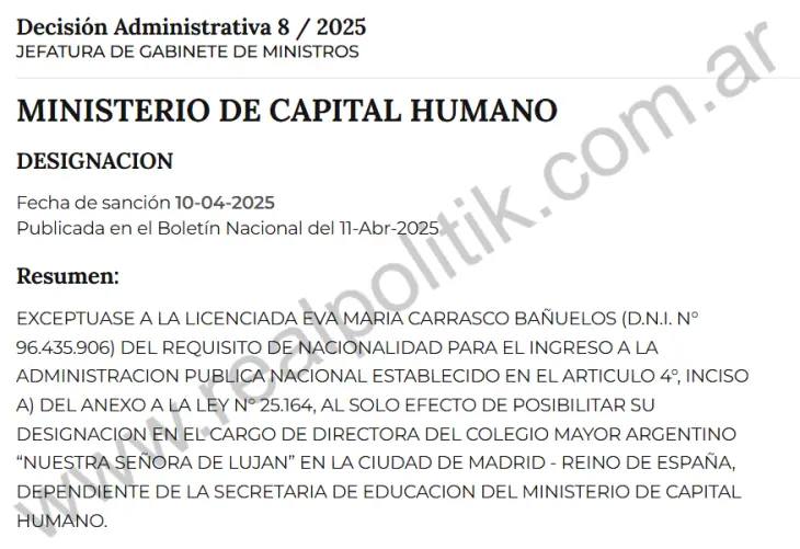 Javier Milei destruye la carrera diplomática pero acomoda amigos en el exterior con sueldo de lujo: mientras congela sueldos a diplomáticos de carrera y vacía la cancillería, milei acomodó por decreto a Eva Carrasco, profesora española sin experiencia diplomática ni vínculo previo con argentina como directora del colegio mayor argentino en madrid. está casada con un amigo personal del libertario.