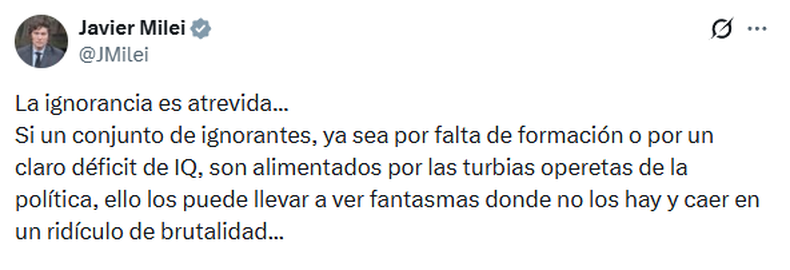 A través de sus redes sociales, el mandatario publicó un mensaje con tono confrontativo, en línea con el discurso oficial que busca desacreditar las denuncias. “La ignorancia es atrevida. Si un conjunto de ignorantes, ya sea por falta de formación o por un claro déficit de IQ, son alimentados por las turbias operetas de la política, ello los puede llevar a ver fantasmas donde no los hay y caer en un ridículo de brutalidad”, escribió Milei.