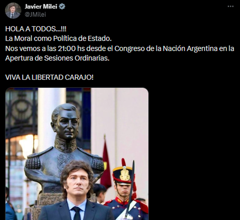 En paralelo, Milei anticipó el tono político de la jornada con un mensaje publicado en su cuenta de X: “Hola a todos!!! La Moral como Política de Estado. Nos vemos a las 21:00 hs desde el Congreso de la Nación Argentina en la Apertura de Sesiones Ordinarias. Viva la libertad carajo!”.