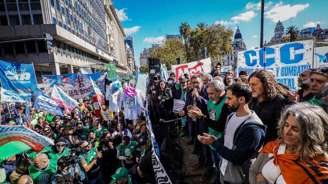 “Frente al intento de infundir miedo, todas estas organizaciones estuvimos acá para pelear y estar al frente en defensa de nuestra dignidad. No puede ser que quiten fondos a las provincias, el Estado Nacional se sigue quedando con el 80% de todo lo que se recauda en impuestos. Se tiene que terminar. Que Milei y Macri dejen de vivir con la nuestra y que la coparticipación se distribuya de acuerdo a las necesidades de cada una de las provincias”, dijo Aguiar ante las y los compañeros.
