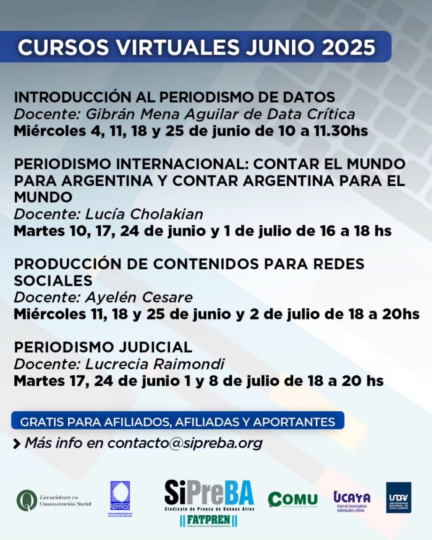 El Sindicato de Prensa de Buenos Aires (SiPreBA) anunció una nueva edición de cursos virtuales gratuitos para sus afiliados y afiliadas, que comenzarán en junio de 2025. La propuesta forma parte de su política sostenida de formación profesional, con talleres orientados a fortalecer las herramientas de trabajo y la inserción laboral en el sector de prensa.