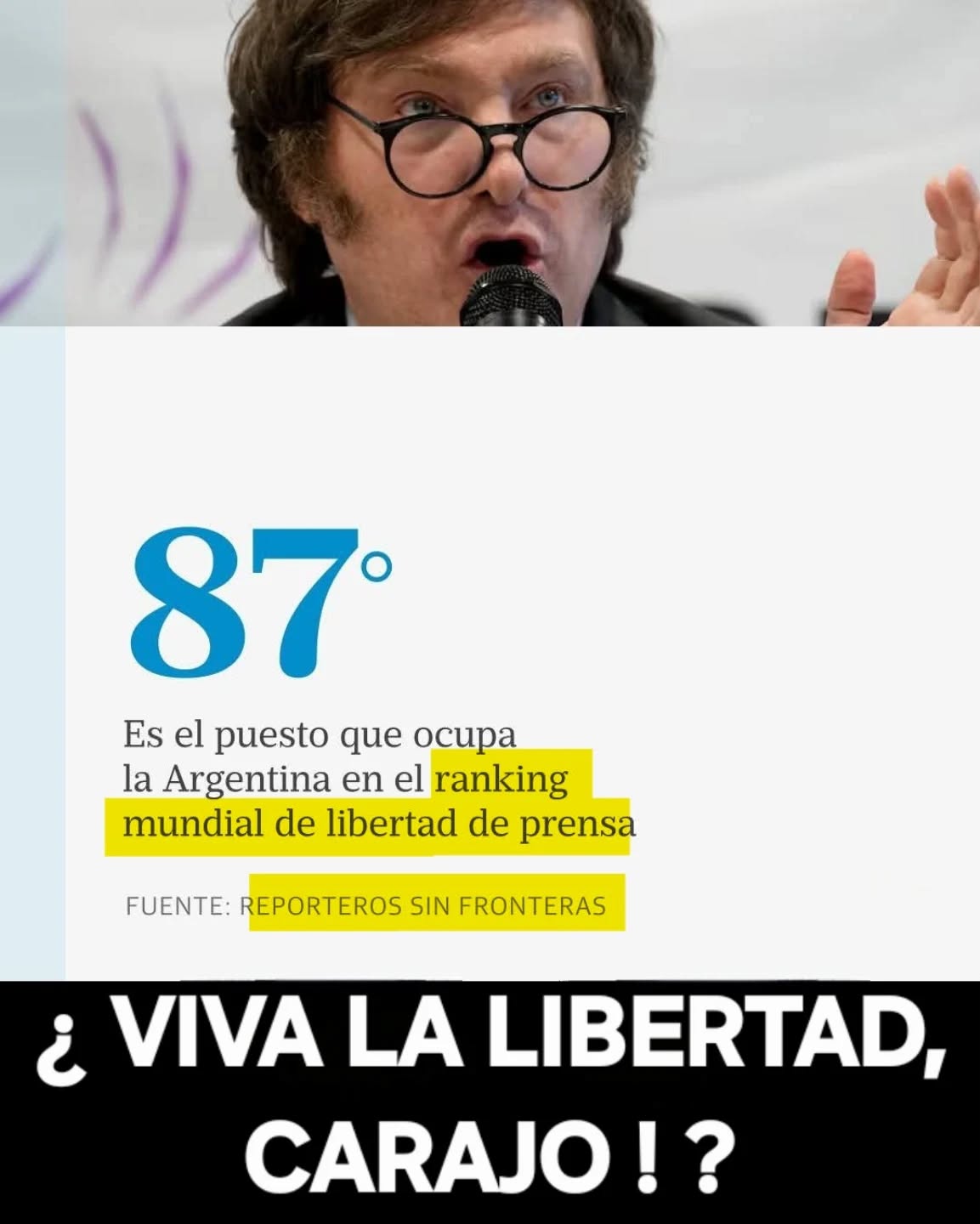 RSF advierte que la llegada al poder de Milei marcó «un nuevo y preocupante punto de inflexión para la garantía del derecho a la información en el país». En el contexto regional, Argentina fue superada en libertad de prensa por naciones como Trinidad y Tobago, Canadá, Uruguay, Brasil y Chile.