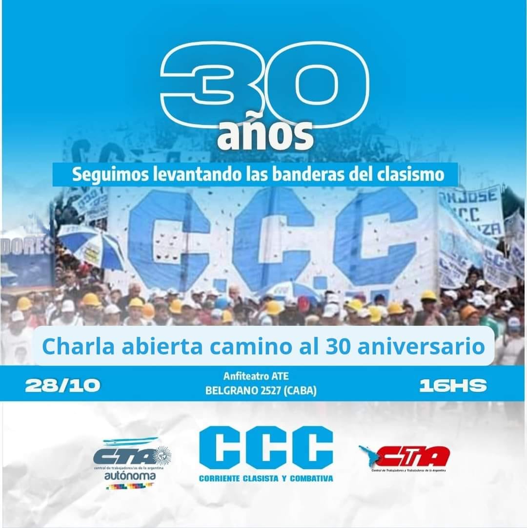 Este lunes 28 de octubre, a las 16 horas, se llevará a cabo un conversatorio en el anfiteatro de ATE, ubicado en la calle Belgrano 2527, CABA, en conmemoración de los 30 años de lucha de la Corriente Clasista y Combativa (CCC).