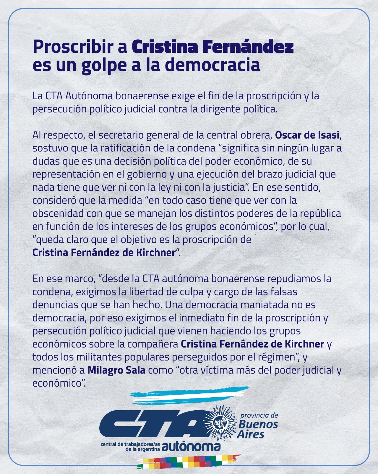 En el mismo sentido, la CTA Autónoma bonaerense expresó: “Repudiamos la condena, exigimos la libertad de culpa y cargo de las falsas denuncias que se han hecho. Una democracia maniatada no es democracia, por eso exigimos el inmediato fin de la proscripción y persecución político judicial que vienen haciendo los grupos económicos sobre la compañera Cristina Fernández de Kirchner y todos los militantes populares perseguidos por el régimen”.