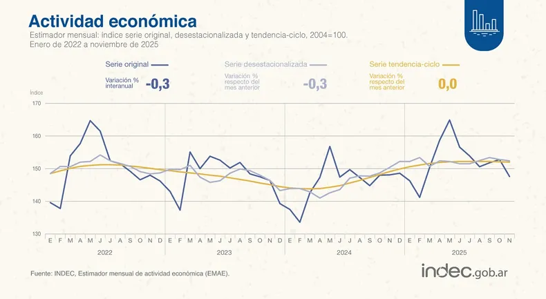 El Instituto Nacional de Estadística y Censos (Indec) dio a conocer que el nivel de actividad económica disminuyó un 0,3% en noviembre de 2025 en comparación con octubre, por lo que interrumpió la racha de subas de los meses previos. Además, se registró una baja interanual de también el 0,3%.