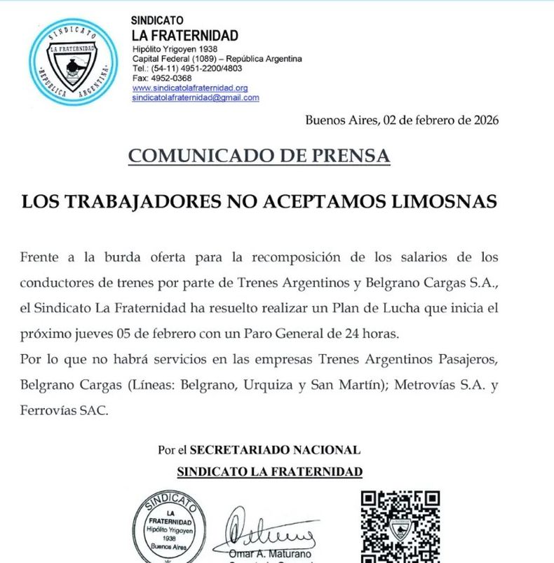“Frente a la burda oferta para la recomposición de los salarios de los conductores de trenes por parte de Trenes Argentinos y Belgrano Cargas S.A., el Sindicato La Fraternidad ha resuelto realizar un Plan de Lucha que inicia el próximo jueves 05 de febrero con un Paro General de 24 horas”, señalaron en el comunicado este lunes.