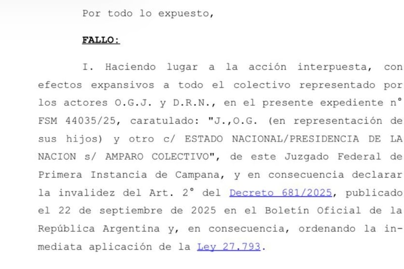 El juez hizo lugar a un amparo colectivo presentado por familias, organizaciones y profesionales del sector, y declara inválido el artículo 2° del Decreto 681/2025, con el que el Gobierno había frenado la aplicación de la ley sancionada en julio. La sentencia sostiene que “nada impide al Estado cumplir con la ley y financiarla como ya hizo en otros casos”, desestimando los riesgos fiscales que argumentó la Casa Rosada.