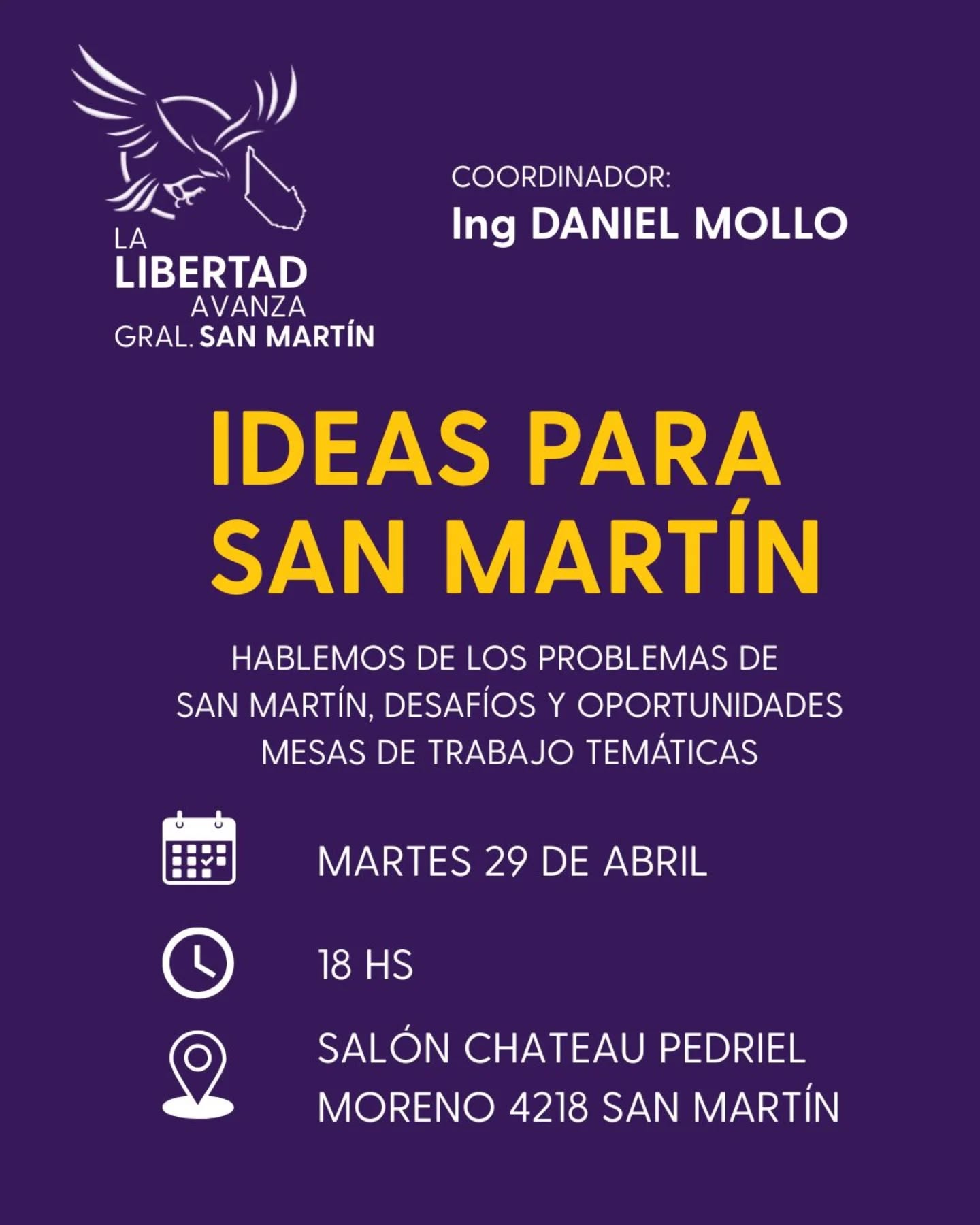 El martes 29 de abril, a las 18 horas, LLA realizará un encuentro en el Salón Chateau Pedriel (Moreno 4218, San Martín) bajo el lema «desafíos, oportunidades y soluciones para San Martín». Giaccio, funcionario en ejercicio en Tres de Febrero, difunde la actividad desde su perfil público, invitando a vecinos a participar.