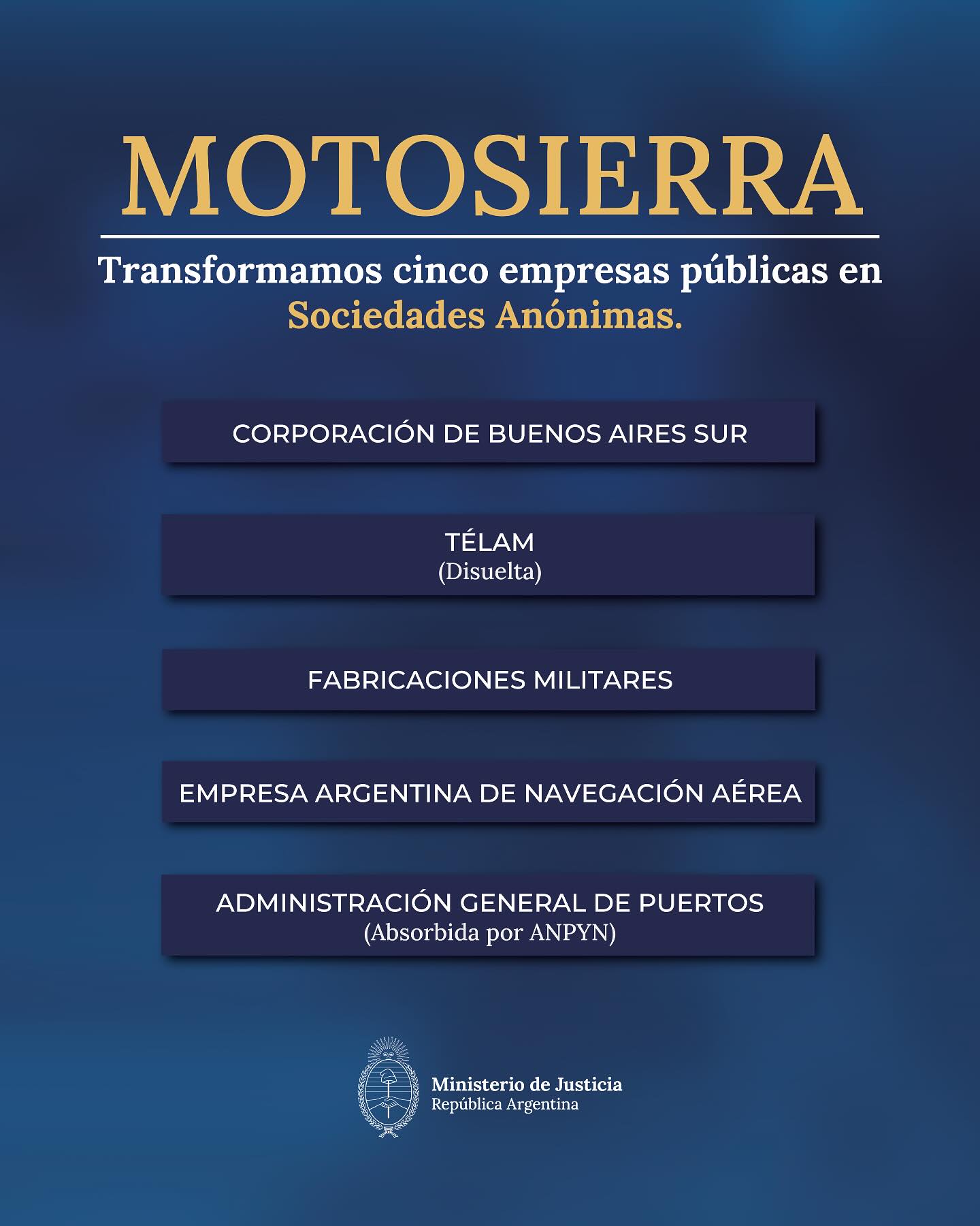 A través del Ministerio de Justicia, se informó la privatización de cinco empresas estatales clave: Corporación Buenos Aires Sur, Agencia Télam (disuelta), Fabricaciones Militares, Empresa Argentina de Navegación Aérea y la Administración General de Puertos. Bajo el argumento de buscar mayor transparencia y eficiencia, estas entidades serán transformadas en sociedades anónimas, en lo que el oficialismo describe como un «paso clave» para terminar con el supuesto uso político de estas empresas.