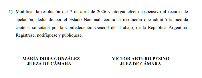 Así, ordenaron: “Modificar la resolución del 7 de abril de 2026 y otorgar efecto suspensivo al recurso de apelación, deducido por el Estado Nacional, contra la resolución que admitió la medida cautelar solicitada por la Confederación General del Trabajo, de la República Argentina.”