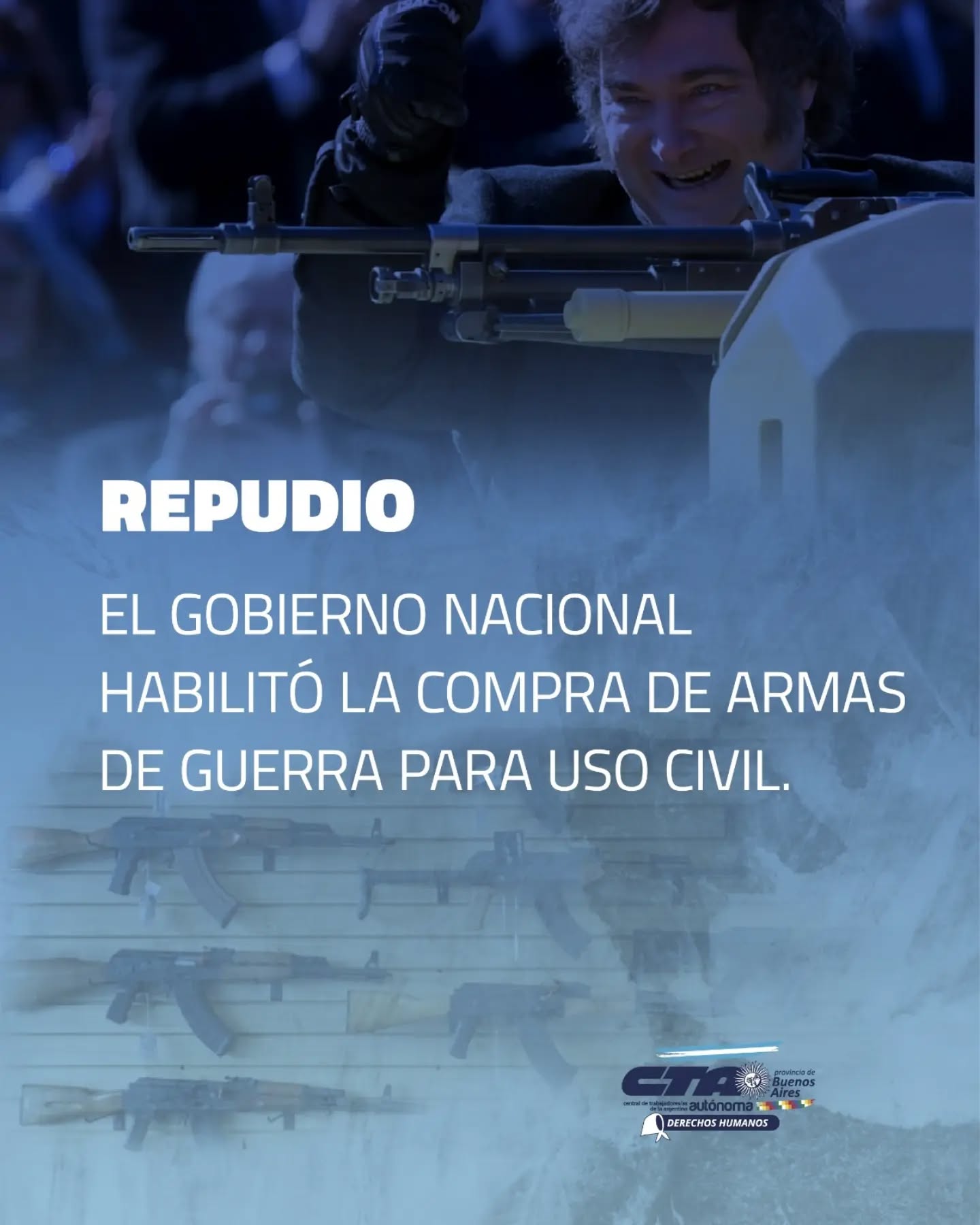 La Secretaría de Derechos Humanos de la CTA Autónoma bonaerense manifestó su enérgico rechazo a la reciente resolución del gobierno nacional que transforma la estructura administrativa encargada del control y regulación del armamento en Argentina.