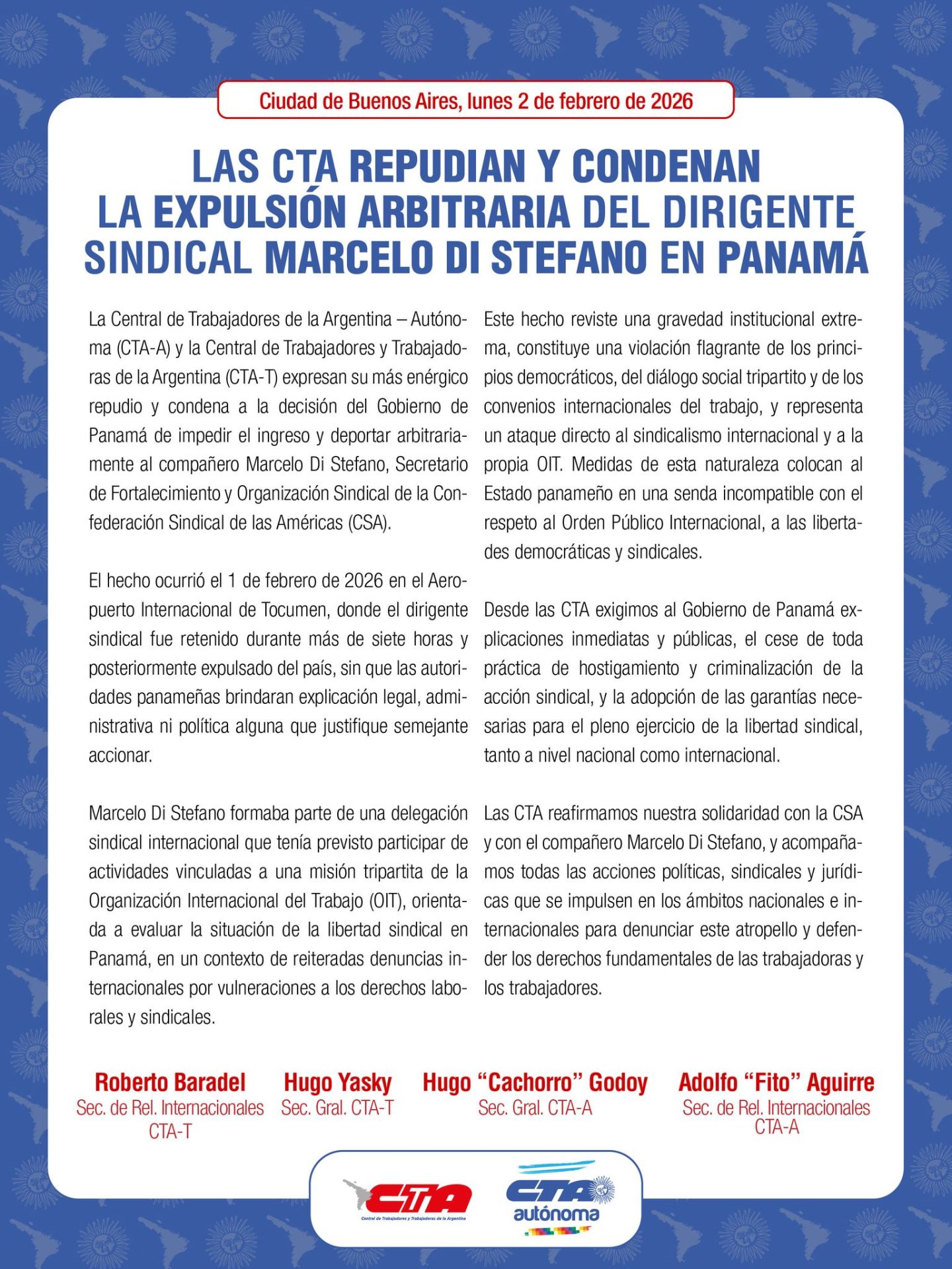 Las dos centrales sindicales argentinas, la CTA Autónoma y la CTA de los Trabajadores, emitieron un comunicado conjunto este lunes para repudiar y condenar la expulsión «arbitraria» del dirigente sindical Marcelo Di Stefano de Panamá. El hecho, ocurrido en las últimas horas, es calificado como un «atropello» que vulnera la libertad sindical, los convenios internacionales del trabajo y el diálogo tripartito impulsado por la Organización Internacional del Trabajo (OIT).